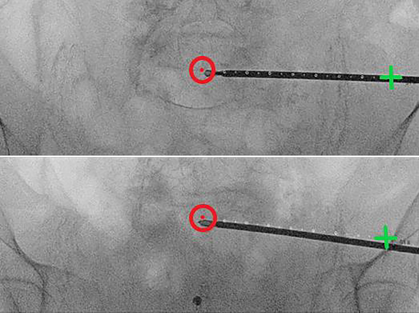 Lateral fluoroscopic image with real-time projection of the planned guide-wire entry point (green cross), its direction (dotted line), and endpoint (red circle). The guidewire is positioned on the bone. Once correctly positioned, it is introduced into the bone via light mallet strikes until it penetrates three cortices. If the correct angle in the axial plane is achieved (usually 10–20°), the guidewire advances along the planned trajectory in the lateral view. The planned screw pathway is visible at all times on the fluoroscopic images, to allow for navigation and direct adjustment of the guidewire. To minimize the surgeon’s radiation exposure, the guidewire is held with a forceps