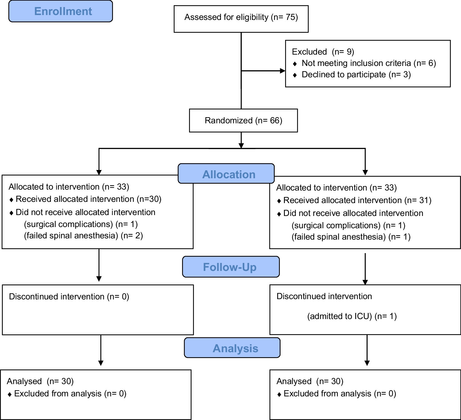 As shown in Fig. 1, 75 patients were assessed for eligibility. Nine were excluded, six did not meet the inclusion criteria, and three declined participation. The remaining 66 patients were randomized into two intervention groups: PENG (n = 33) and PENG + DEX (n = 33). In the PENG group, 30 patients received the allocated intervention, while three patients did not receive the intervention due to surgical complications (n = 1) and failed spinal anaesthesia (n = 2). Similarly, in the PENG + DEX group, 31 patients received the allocated intervention, while two patients did not receive it due to surgical complications (n = 1) and failed spinal anaesthesia (n = 1). During the follow-up period, one patient in the PENG + DEX group discontinued the intervention due to ICU admission. No other patients were lost to follow-up in either group. At the end of the study, 30 patients from each group were analyzed, with no patients excluded from the final analysis. No clinically relevant differences were observed among the group characteristics, as shown in Table 1.
