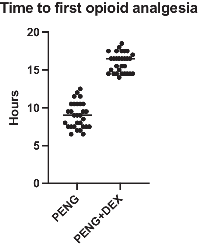 The time to first rescue opioid analgesia was significantly prolonged in the PENG + DEX group compared to the PENG group, as presented in Table 2 and in Fig. 2. Patients in the PENG + DEX group required their first rescue analgesia at a mean of 16.0 ± 1.3 h, whereas patients in the PENG group required rescue analgesia significantly earlier, at 9.0 ± 1.7 h (p < 0.0001). The mean difference between the groups was 7.5 h (95% CI: 6.0 to 8.0 h).