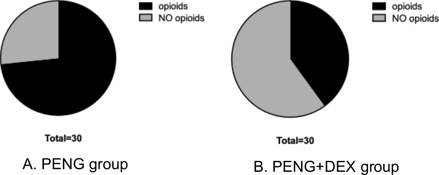The sample size was based on our primary hypothesis that the time to first rescue opioid analgesia would be significantly longer in the PENG + DEX group than that in the PENG group. Our null hypothesis was that there would be no significant difference in the time to first rescue analgesia between these two groups. The time to first rescue opioid analgesia was the primary variable. Based on a pilot study on ten patients, not included in the final analysis, the time to first rescue opioid analgesia was 9.46 ± 4.43 h (mean ± SD) in the PENG group and 14.26 ± 4.16 h (mean ± SD) in the PENG + DEX group. Using pairwise comparison, we calculated the sample size required to detect a difference in the time to first rescue opioid analgesia among the two groups. Accordingly, 22 subjects were required in each group to achieve a statistical power of 95% at a p-value of < 0.05. To facilitate block randomization and account for loss to follow-up, 30 patients per group (60 in total) were recruited.