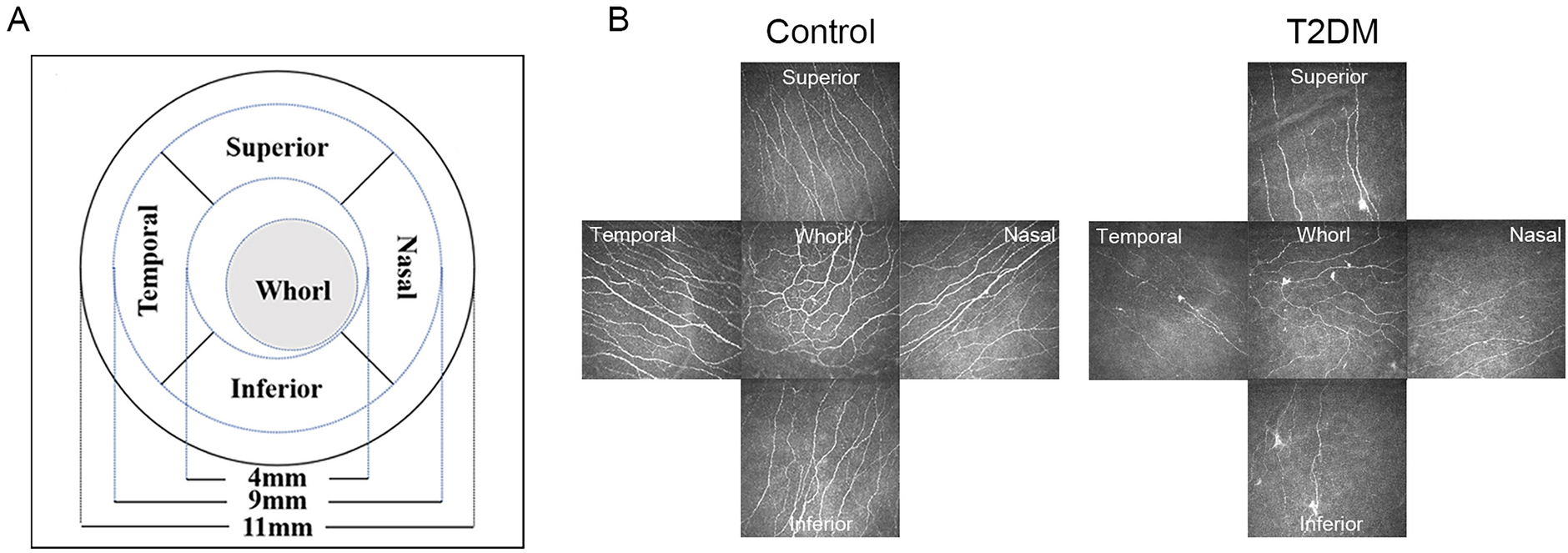 Representative in vitro confocal microscopy (IVCM) images of A the five zones and their corresponding diameters and B comparative images of the four peripheral and whorl corneal zones from the right eye of a nondiabetic individual and a patient with type 2 diabetes mellitus (T2DM)