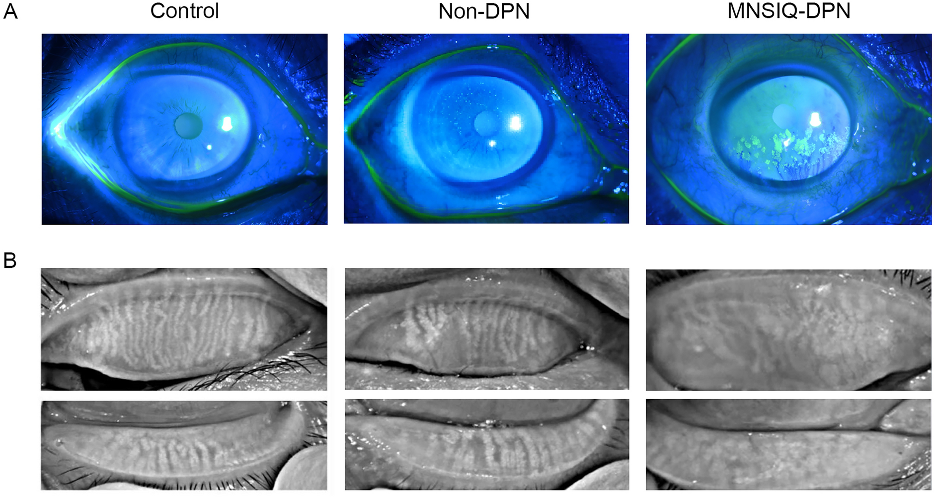 The Michigan Neuropathy Screening Instrument Questionnaire (MNSIQ) was used to categorize patients with T2DM into MNSIQ-DPN and non-DPN groups. Ocular irritation symptoms were evaluated using the Ocular Surface Disease Index (OSDI) questionnaire. Ocular surface lesions were assessed via Cochet–Bonnet esthesiometry, corneal fluorescein staining (CFS), the Schirmer I tear test (SIT), tear meniscus height (TMH), noninvasive keratography break-up time (NIKf-BUT), and the meibomian gland loss (MGL) grade detected by OCULUS. Corneal nerve fiber parameters were evaluated using in vivo confocal microscopy (IVCM).