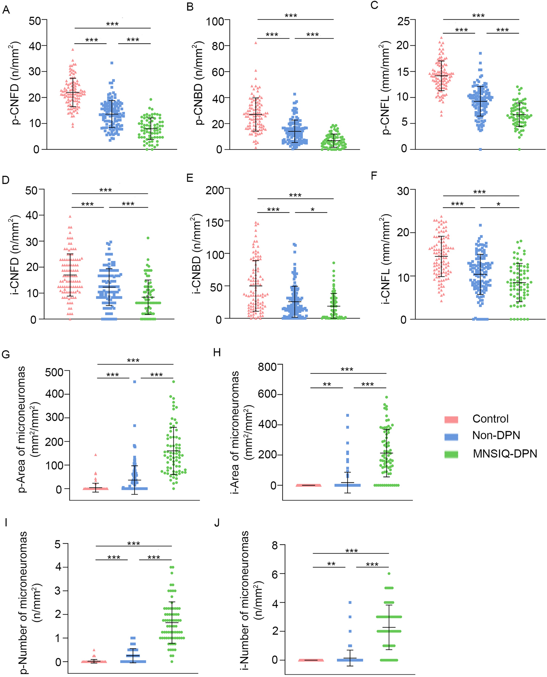 A total of 116 patients diagnosed with T2DM (60.83 ± 9.02 years) were included in the diabetic group, whereas 51 age- and sex-matched healthy participants (57.29 ± 7.99 years) were included in the control group. Within the diabetic group, 76 patients with T2DM did not have DPN (non-DPN group), whereas 40 patients had DPN, as determined by the MNSIQ (MNSIQ-DPN group).