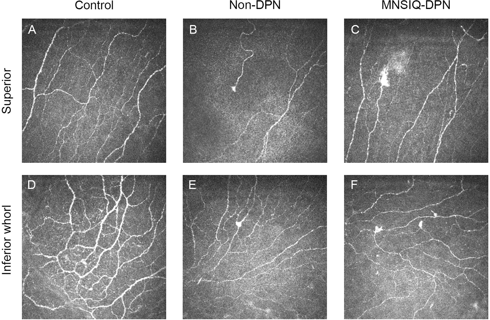 A total of 116 patients with T2DM, comprising 76 non-DPN patients and 40 MNSIQ-DPN patients, along with 51 age-matched participants without diabetes, were enrolled. Although OSDI scores were equivalent between MNSIQ-DPN patients and non-DPN patients, MNSIQ-DPN patients presented significantly more severe CFS (p < 0.001), meibomian gland dysfunction (MGD) (p < 0.001), corneal nerve fiber loss (p < 0.001), sensory dysfunction (p = 0.02), and corneal microneuromas (p < 0.001). The MNSIQ score was significantly positively correlated with CFS (p < 0.001); MGD (p < 0.01); corneal nerve fiber loss, including corneal nerve fiber density and length and branch density, in the paracentral (all p < 0.001) and inferior-whorl areas (p < 0.01, p < 0.05 and p < 0.01, respectively); and corneal microneuromas, characterized by increased microneuroma numbers (p < 0.001) and areas (p < 0.001) in these regions.