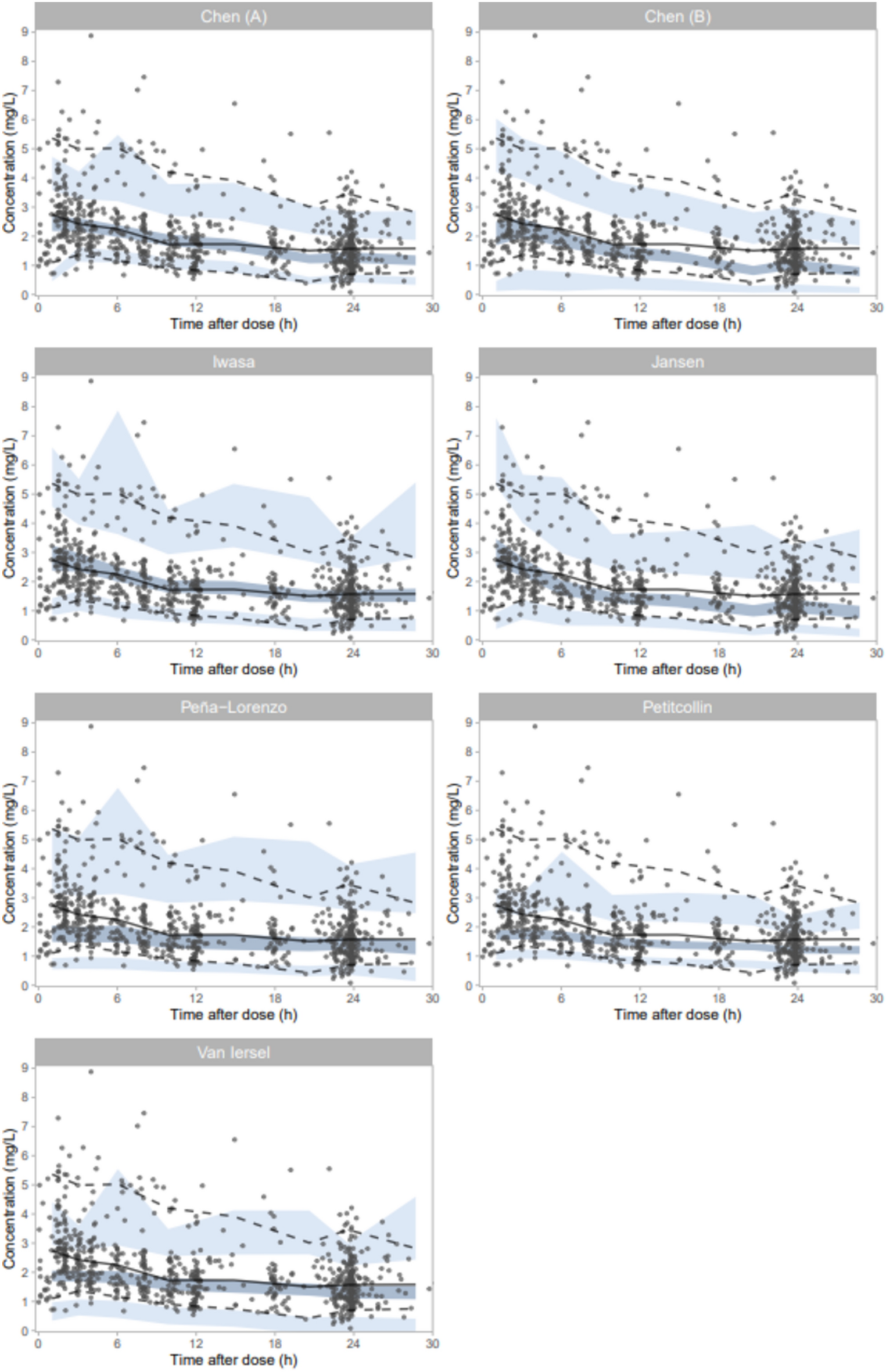 In Fig. 2, the VPCs of the identified models on the external evaluation data are shown. It can be observed that the data are generally adequately described by most models, but that the Iwasa model fits the data best. This is reflected by the lines for the median, 5th and 95th percentiles of the observed data falling within the shaded areas of the simulated data over the complete concentration-time curve. The Chen (B) model, Petitcollin model, and Van Iersel model seem to generally underpredict the observed concentrations.