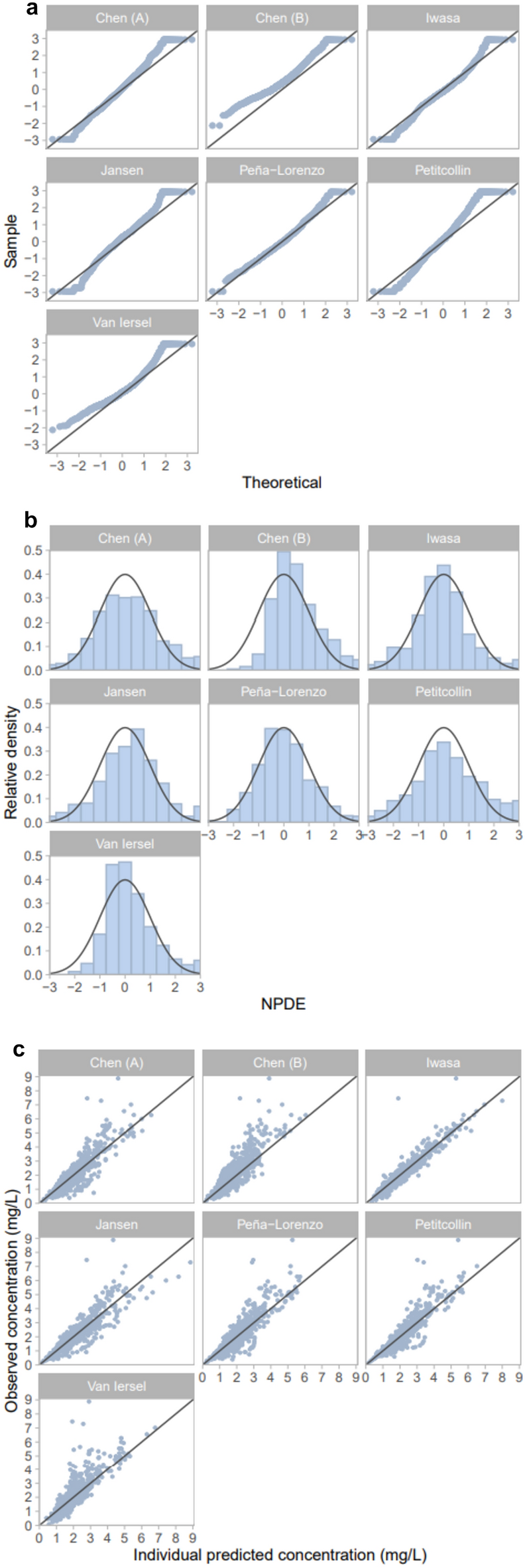Figure 3 shows the distribution of the NPDE in quantile-quantile (QQ) plots and histograms. For the Iwasa, Jansen, Peña-Lorenzo, and Petitcollin models, the sample quantiles follow the theoretical quantiles, indicated by datapoints in the QQ plots following the theoretical normal distribution line, with slight curve-offs at the extreme values. Additionally, for these models, the distribution of NPDEs are most congruent with that of the overlaid normal distribution in the histograms, indicating accuracy of model predictions. In addition, Fig. 3 shows the individual predicted versus observed concentrations for the identified models. Here, it can be observed that for the Chen (A), Iwasa, Jansen, Peña-Lorenzo, and Petitcollin models, the data are scattered uniformly around the line of unity.