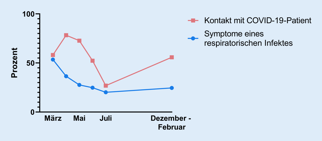 Die Häufigkeit von Symptomen eines respiratorischen Infekts zwischen 2 Blutentnahmen war über den Studienzeitraum abnehmend (Abb. 1). Zum Zeitpunkt der maximalen Anzahl an COVID‑19-Patienten am Universitätsklinikum Regensburg während der ersten Welle gaben 78,3 % und während der zweiten Welle 55,8 % der Teilnehmer an, Kontakt zu einem infektiösen Patienten gehabt zu haben (Abb. 1). Bei lediglich einer Körpertemperaturmessung wurde eine Temperatur über 38 °C festgestellt, wobei keine SARS-CoV-2-Infektion bei dem Probanden nachgewiesen werden konnte.