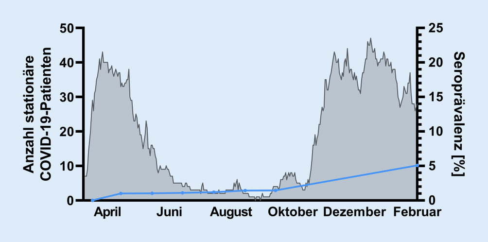 Verlauf der Seroprävalenz über den Studienzeitraum (blaue Linie) in Relation zu den stationär behandelten Patienten am Universitätsklinikum Regensburg (graue Fläche)