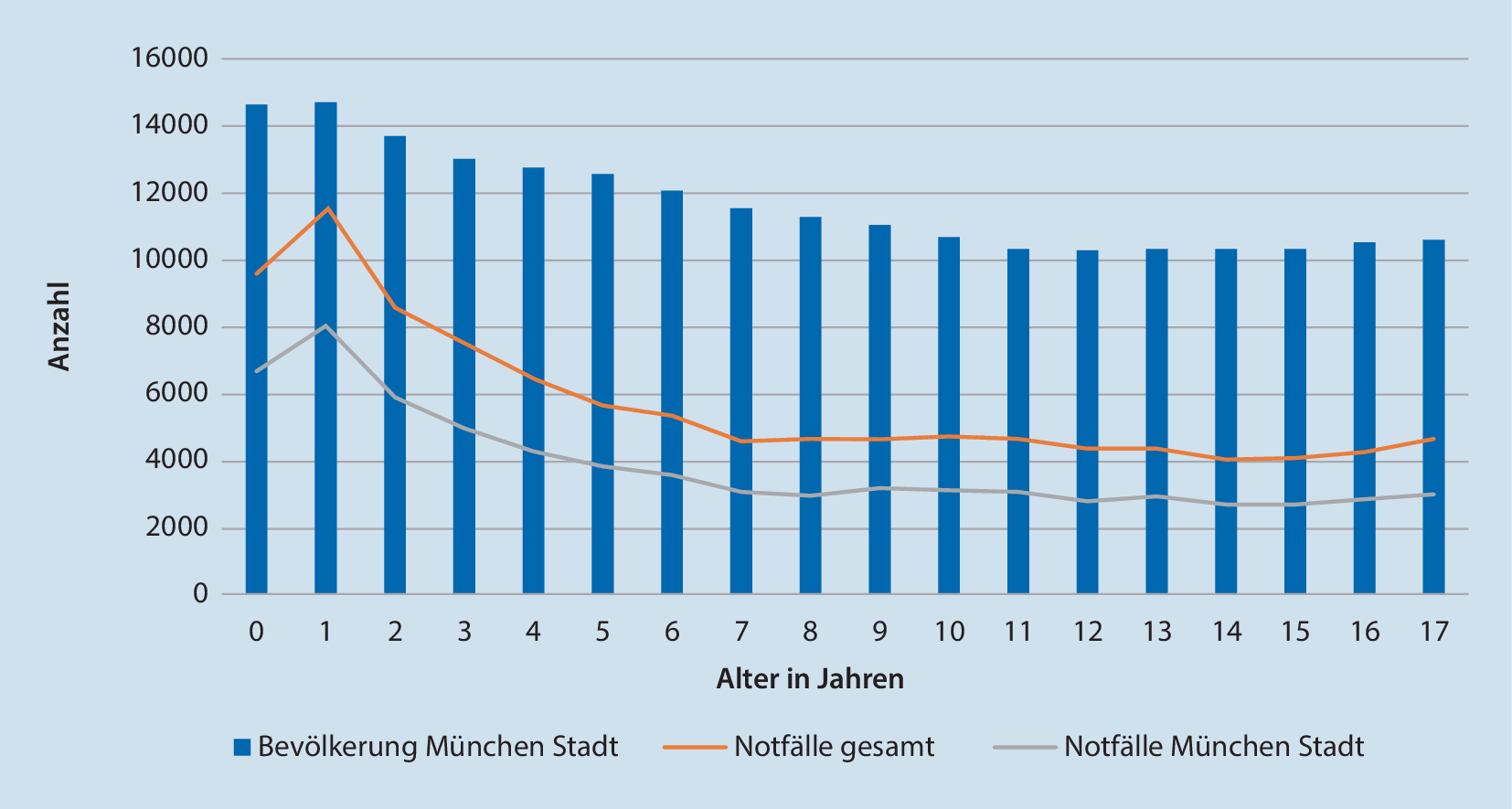 Im Beobachtungszeitraum wurden 103.830 Kinder versorgt (mittleres Alter: 6,9 ± 5,4 Jahre; 55,0 % Jungen, 45 % Mädchen). Davon lebten 69.982 (67,4 %) im Stadtgebiet München. Abb. 1 stellt die Anzahl der Notfälle der jeweiligen Bevölkerungsanzahl gegenüber. Die übrigen Fälle kamen aus dem Landkreis München oder anderen geografischen Regionen.