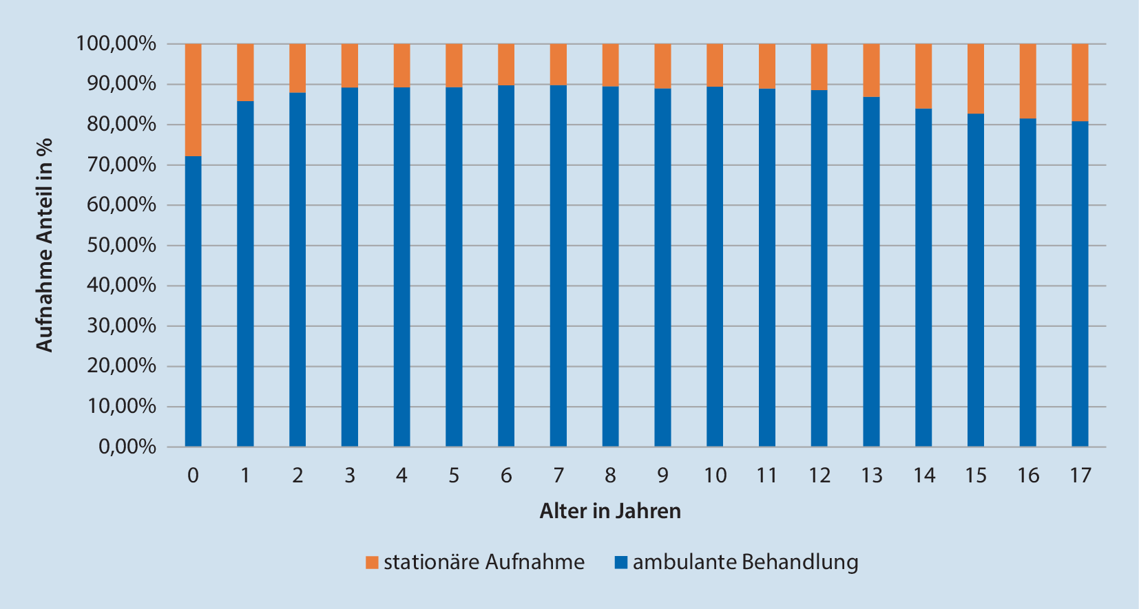 Knapp 50 % der Fälle sind unter 6 Jahre alt. Die meisten Fälle konnten ambulant versorgt werden (85,9 %). Stationär wurden 12,4 % auf die Normalstation und 1,7 % auf die Intensivstation aufgenommen (Tab. 1). Relativ gesehen zeigte sich mit 5,4 % ein hoher Bedarf an intensivmedizinischen Ressourcen für die Altersgruppe Neonaten und Säuglinge (528/9731) im Gegensatz zu 1,2 % (251/20.121) für Kleinkinder, 1,2 % für frühe Kindheit (220/19661), 1,1 % für späte Kindheit (311/28.559) und 1,8 % für Adoleszente (473/25.758). Abb. 2 stellt den Anteil der ambulanten Fälle in Abhängigkeit des Patientenalters dar. Auch hier hatten Neonaten und Säuglinge einen hohen Anteil stationär versorgter Fälle.