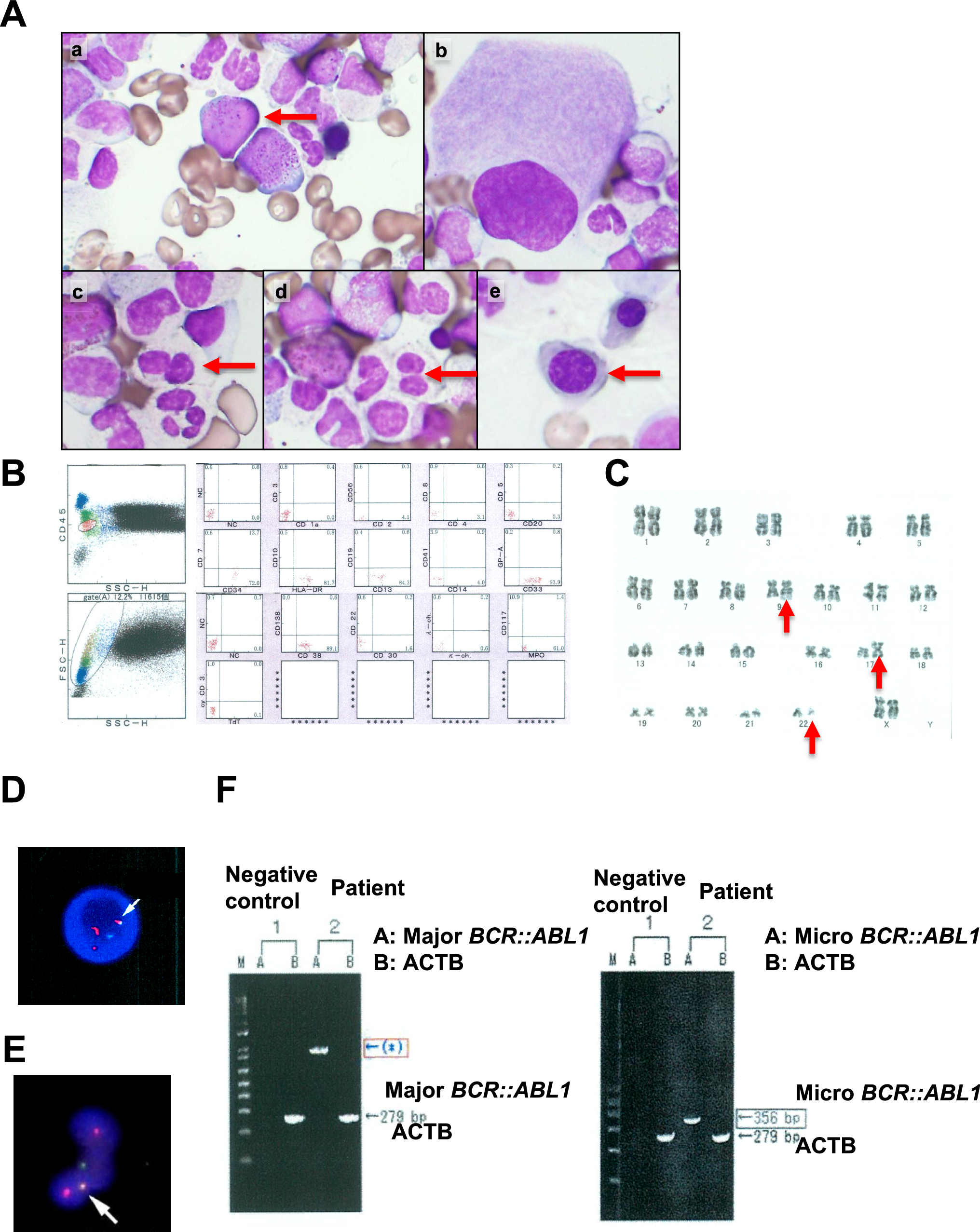 An 86-year-old woman presented with anemia. She had chronic heart failure (CHF) and chronic kidney disease (CKD). Laboratory tests revealed the following findings: hemoglobin, 6.5 g/dL; platelet count, 158 × 109/L; leukocyte count, 5.0 × 109/L without blasts; prothrombin time (PT), 27.1 s; activated partial thromboplastin time (APTT), 50.9 s; FDP, 2.9 µg/mL; D-dimer, 0.80 µg/mL; fibrinogen 291.0 mg/dL. A bone marrow examination revealed a nucleated cell count of 426 × 109/L, myeloblasts with 2.3% positive for peroxidase (Fig. 1A-a), and multilineage dysplasia was recognized including neutrophilic degranulation, pseudo-Pelger nuclear anomaly, erythroblast of megaloblastic change and single nucleus megakaryocyte (Fig. 1A-b–e). Flow cytometry revealed positivity for several myeloid markers including CD 13, CD 33, CD 34, CD 117, HLA-DR and MPO (Fig. 1B). A chromosomal analysis revealed 46, XX, t(9;22)(q34.1;q11.2), i(17)(q10) [20] (Fig. 1C). A FISH analysis of bcr::abl1 revealed 87% positivity in the bone marrow (Fig. 1D) and peripheral neutrophils (Fig. 1E). Reverse transcription polymerase chain reaction (RT-PCR) results were positive for μ-bcr and negative for M-bcr (Fig. 1F). RT-PCR analysis revealed that μ-bcr mainly produced Ph-positive MDS in this case. The patient was finally diagnosed with myelodysplastic syndrome with multilineage dysplasia (MDS-MLD) with μ-bcr. The revised International Prognostic Scoring System (IPSS-R) score was high (4.5).