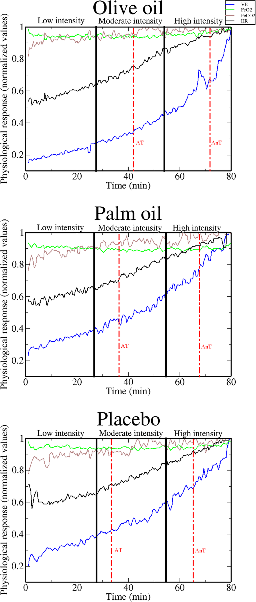 1 at moderate intensity, VE projection was shown to be significantly higher in olive oil compared to palm oil supplementation. This means that the increment in the degree of CRC observed under olive oil supplementation was mainly provoked by a change in VE behaviour (i.e., a decrease in the absolute values of VE while performing at moderate intensity and at AT; see Fig.