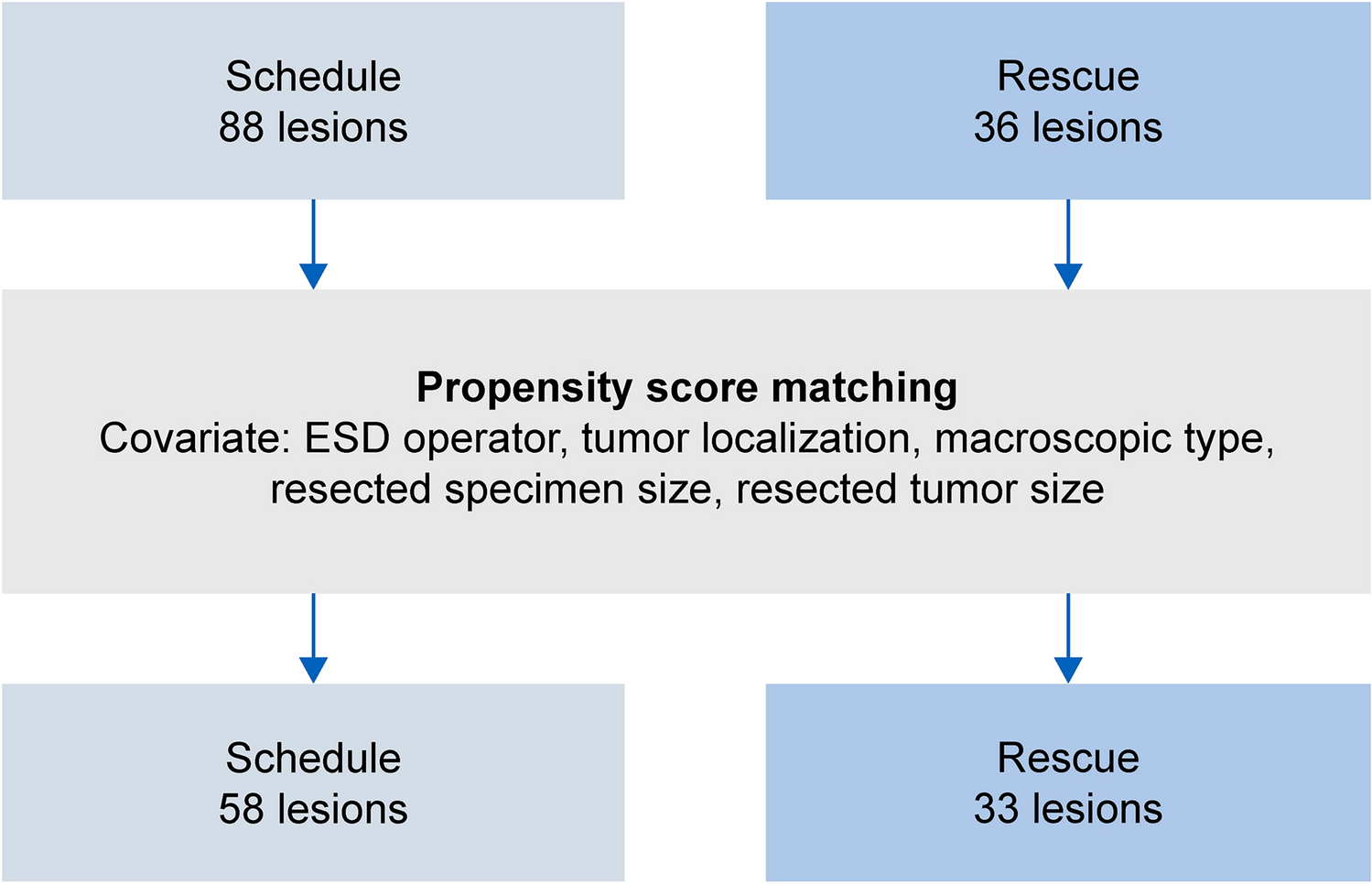 We retrospectively analyzed lesions (20–50 mm) resected at Saitama Medical University International Medical Center from July 2022 to January 2024. Lesions were divided into the conventional ESD group (C-ESD) and the ETD group (T-ESD); the T-ESD group was further split into the schedule (S) group, where ETD was planned early, and the rescue (R) group, where continued treatment was difficult. Propensity score matching (PSM) was used to balance baseline factors.