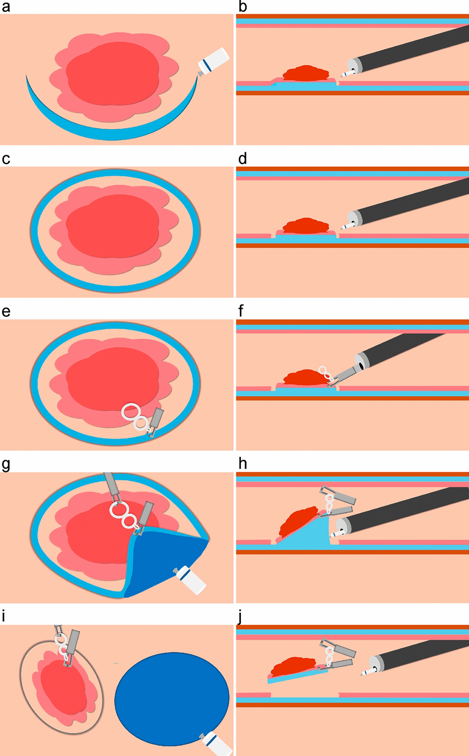 Schematic diagram showing the treatment strategy of the S group. a, c, e, g, i From a top view. b, d, f, h, j From a side view. a, b The initial mucosal incision was made on the anal or oral side of the lesion. c, d A circumferential mucosal incision around the lesion and a slight submucosal dissection were performed. e, f The ETD was attached. g, h The band portion was gripped with a SureClip (MICRO-TECH, Nanjing, China) and fixed at the opposite site. Traction improved the visibility of the submucosal layer and allowed for easier submucosal dissection. i, j The dissection was then continued sequentially, leading to the en bloc resection of the lesion. ETD Elastic Traction Device