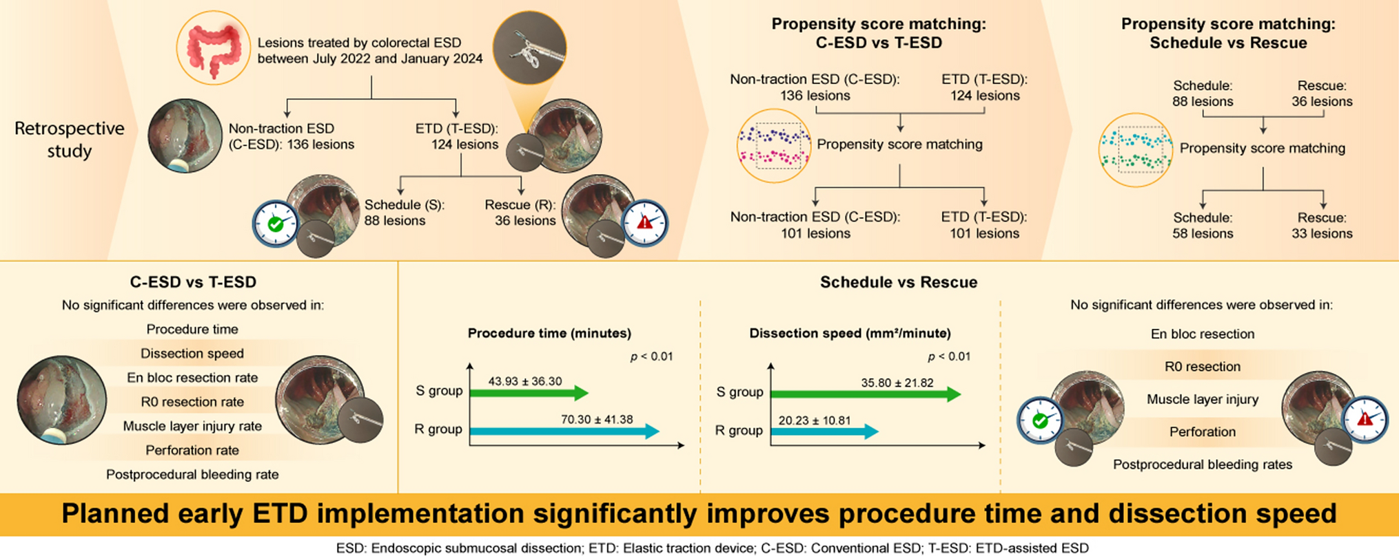 Although the ETD did not consistently reduce procedure time or improve dissection speed, its planned and early application may offer potential benefits. Further prospective multicenter studies are needed to clarify its optimal role and clinical value in colorectal ESD.