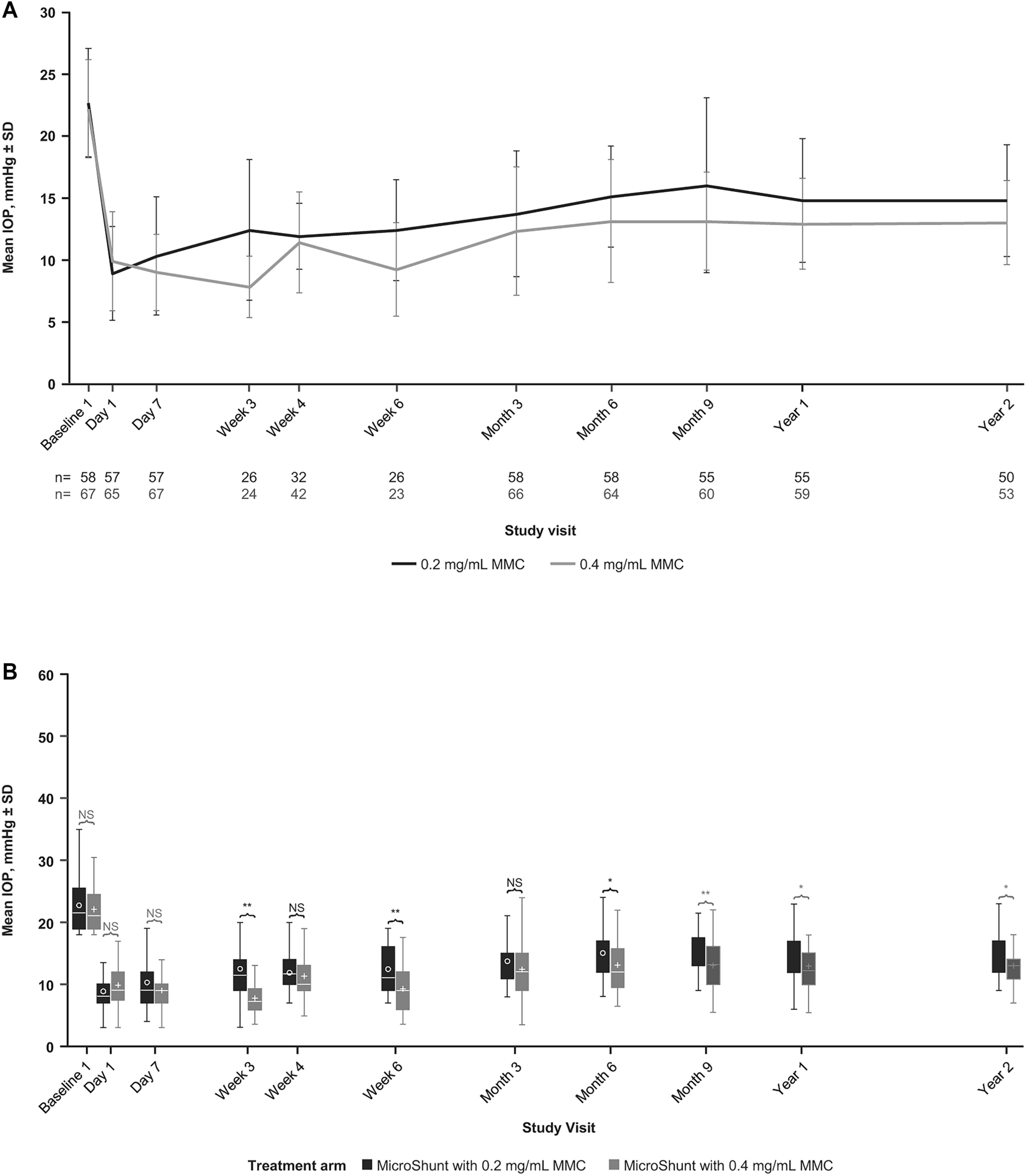 Determination of intraocular pressure over time in patients administered 0.2 and 0.4 mg/ml MMC. A Mean IOP from baseline to year 2. B Mean and median IOP over 2 years of follow-up (per-protocol population). IOP intraocular pressure, MMC mitomycin C