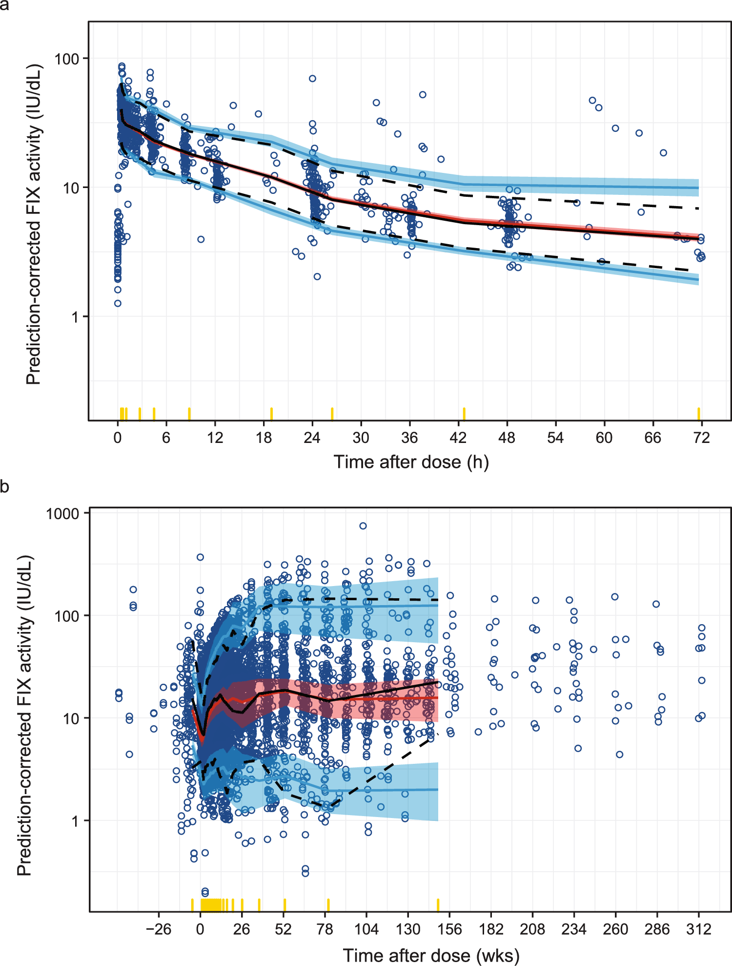 Perceived outlier observations (absolute conditional weighted residuals [CWRES] > 6) were not considered for removal because of the possibility that they could be due to unaccounted doses of FIX replacement therapy or transient changes in FIX activity. Model adequacy was assessed by changes in the minimum objective function value (OFV) and condition number (square root of the ratio of the highest and lowest eigenvalues). Models with condition numbers < 100 were highly considered [27].
