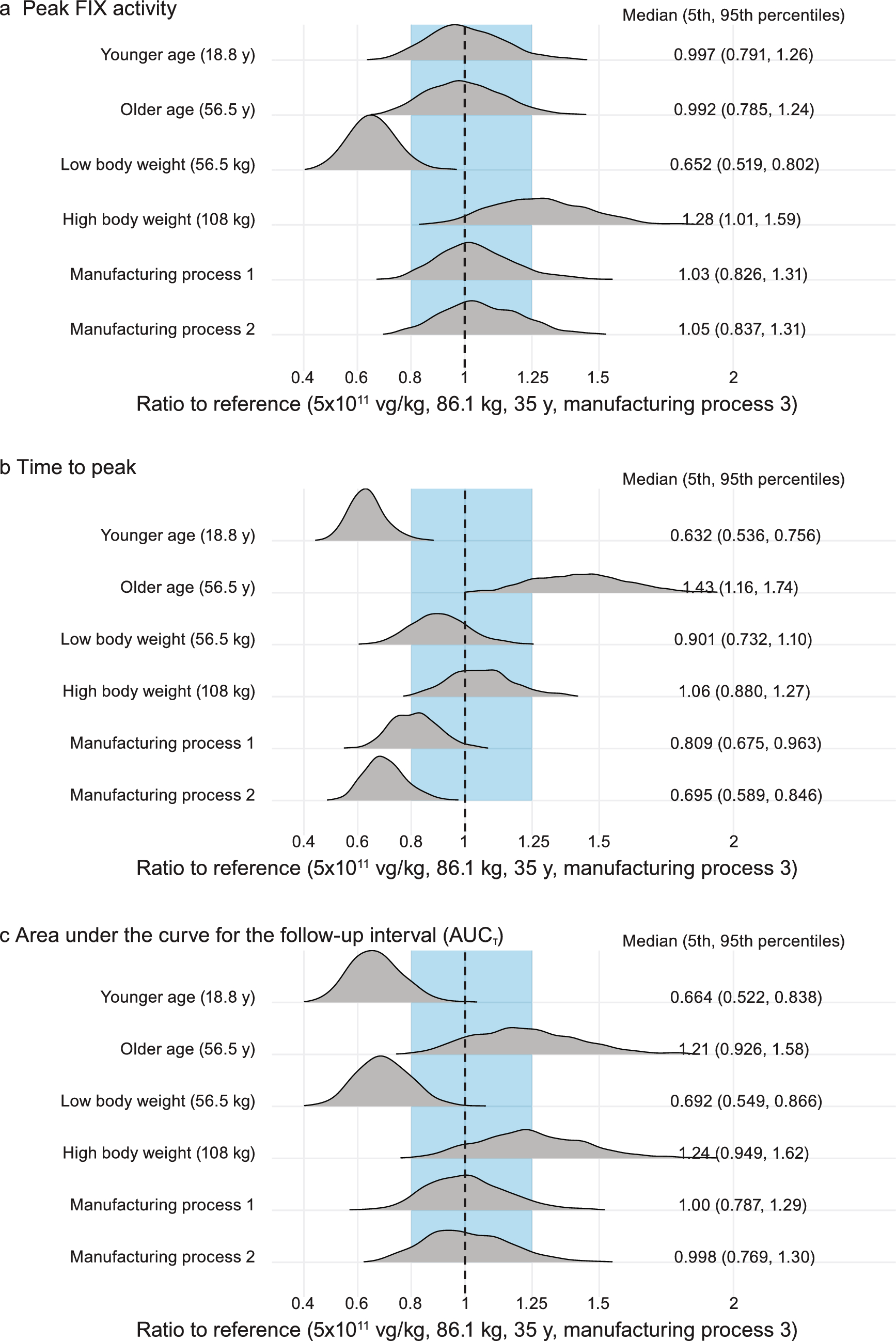 Ratios of peak FIX activity, time to peak, and area under the curve for the follow-up interval (AUCτ) to reference FIX activity following administration of fidanacogene elaparvovec for included covariates. For each covariate scenario on the left y-axis, FIX activity-time profiles for 1000 trials of 63 randomly drawn individuals administered 5×1011 vg/kg of fidanacogene elaparvovec were simulated for 15 years and summarized by a peak FIX activity, b time to peak, or c AUCτ based on the Actin® FSL assay. The geometric mean ratio of a peak FIX activity, b time to peak, or c AUCτ compared with the reference scenario (86.1-kg individual, aged 35 years, manufacturing process 3 used) was calculated for each trial. The gray density distributions represent the geometric mean ratios across all trials. Black numbers on the right y-axis are the median (5th and 95th percentiles) of ratios for the covariate scenario. The blue shaded region is the range of geometric mean ratios from 0.8 to 1.25, and the black vertical dashed line is a geometric mean ratio of 1. Reference low and high values are the 5th and 95th percentiles of the analysis population. Summaries are based on a mixed population comprising 72% and 28% of the subpopulation 1 and 2 phenotypes, respectively. Ratios depicted are independent of other intrinsic or extrinsic factors that may modify metrics following administration of fidanacogene elaparvovec. AUCτ area under the curve for the follow-up interval, FIX factor IX