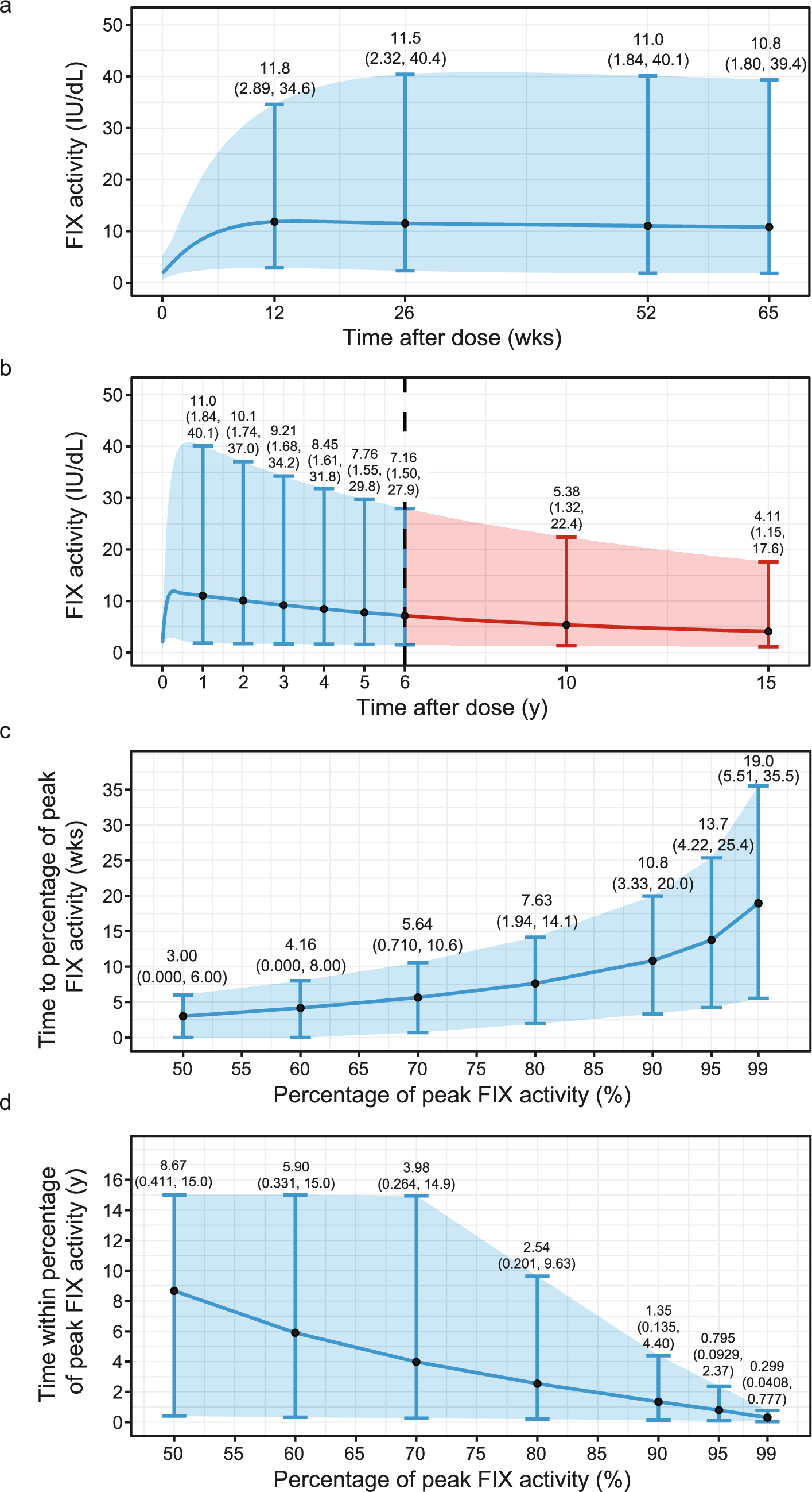 Median (90% PI) peak FIX activity was 13.5 (3.12–41.3) IU/dL, with a median time to peak of 25.3 (6.70–48.7) weeks. Individuals reached 50% of their peak FIX activity within a median of 3.00 (0.000–6.00) weeks and 90% of their peak FIX activity within a median of 10.8 (3.33–20.0) weeks (Fig. 4c). Individuals were predicted to remain within 90% of their peak FIX activity for a median of 1.35 (0.135–4.40) years and within 50% for a median of 8.67 (0.411–15.0) years (Fig. 4d).