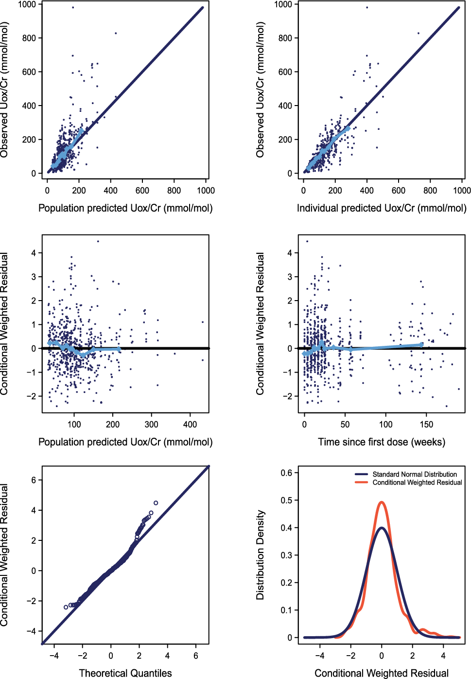 In our previous study [29], a comprehensive dataset comprising PK data from 143 HVs and patients with PH1 or PH2 and PD data (24-h Uox) from 46 patients with PH1 enabled the identification of significant covariates in the Pop-PK model, such as body weight, eGFR, and disease status. In this Pop-PK model, additional data were added from pediatric patients aged < 18 years from PHYOX3 (n = 1) and PHYOX8 (n = 21) to the dataset and patients who rolled over from PHYOX1 to PHYOX3 (n = 16) were not considered as new patients, unlike in the previous Pop-PK model. This resulted in 2087 PK data from 148 participants, including HVs and patients with PH1 or PH2. Additionally, 688 spot Uox/Cr observations from 41 patients with PH1 were included to develop the final Pop-PK and Pop-PK/PD models.
