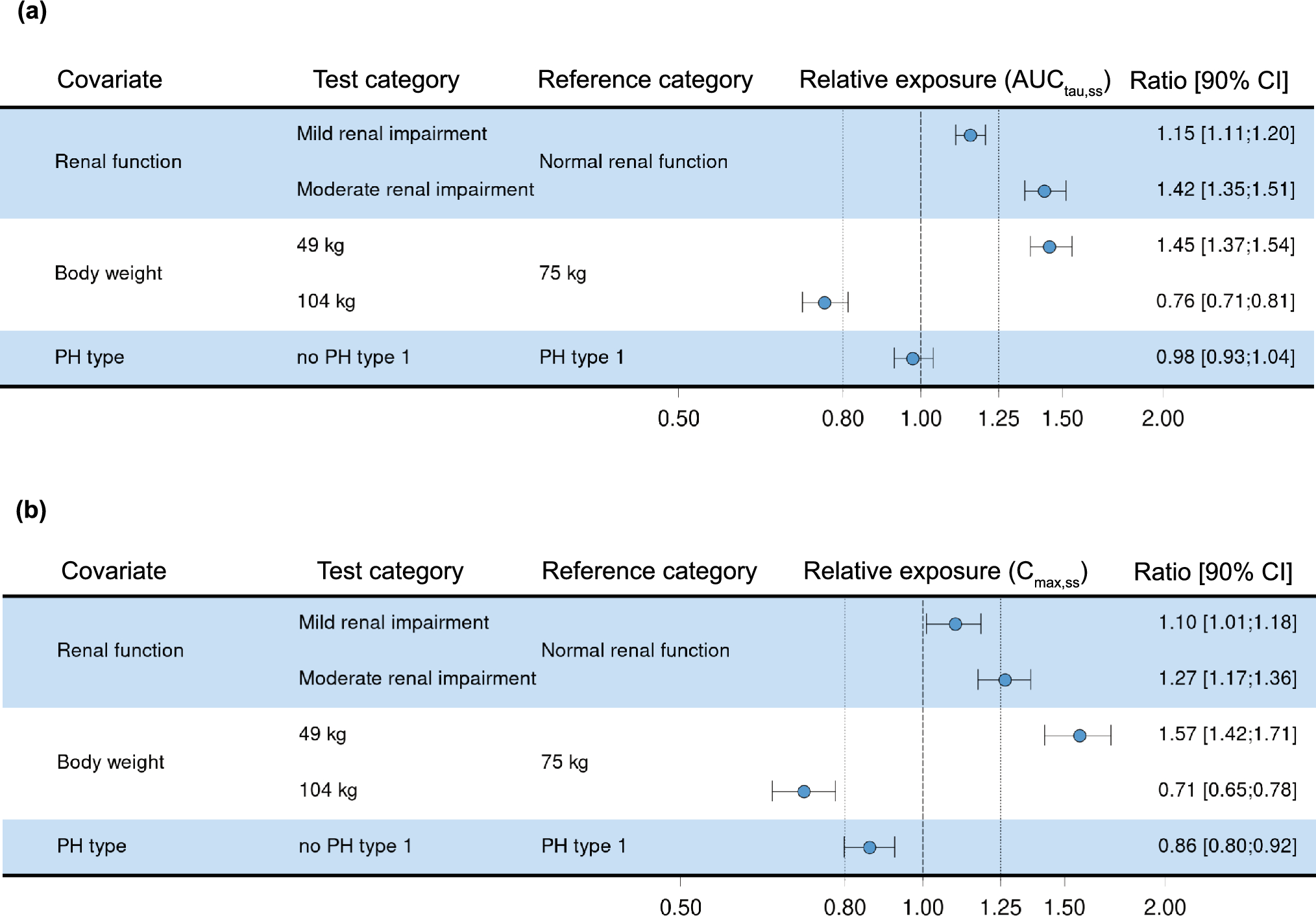 In the final Pop-PK model, a covariate analysis identified body weight, eGFR, and PH type as significant covariates. Simulated from the final Pop-PK model, body weight was associated with variations in nedosiran exposures, showing increased exposure in participants with the 5th percentiles and decreased exposure in participants with the 95th percentiles of body weight. Moderate renal impairment (eGFR 30–59 mL/min/1.73 m2) was associated with increased exposure. In contrast, mild renal impairment (eGFR 60–89 mL/min/1.73 m2), PH2 type, and status as an HV showed no significant effect on nedosiran exposure. In addition, the plasma concentrations of nedosiran in one participant with transient treatment-emergent anti-drug antibodies were comparable to those of the other participants.
