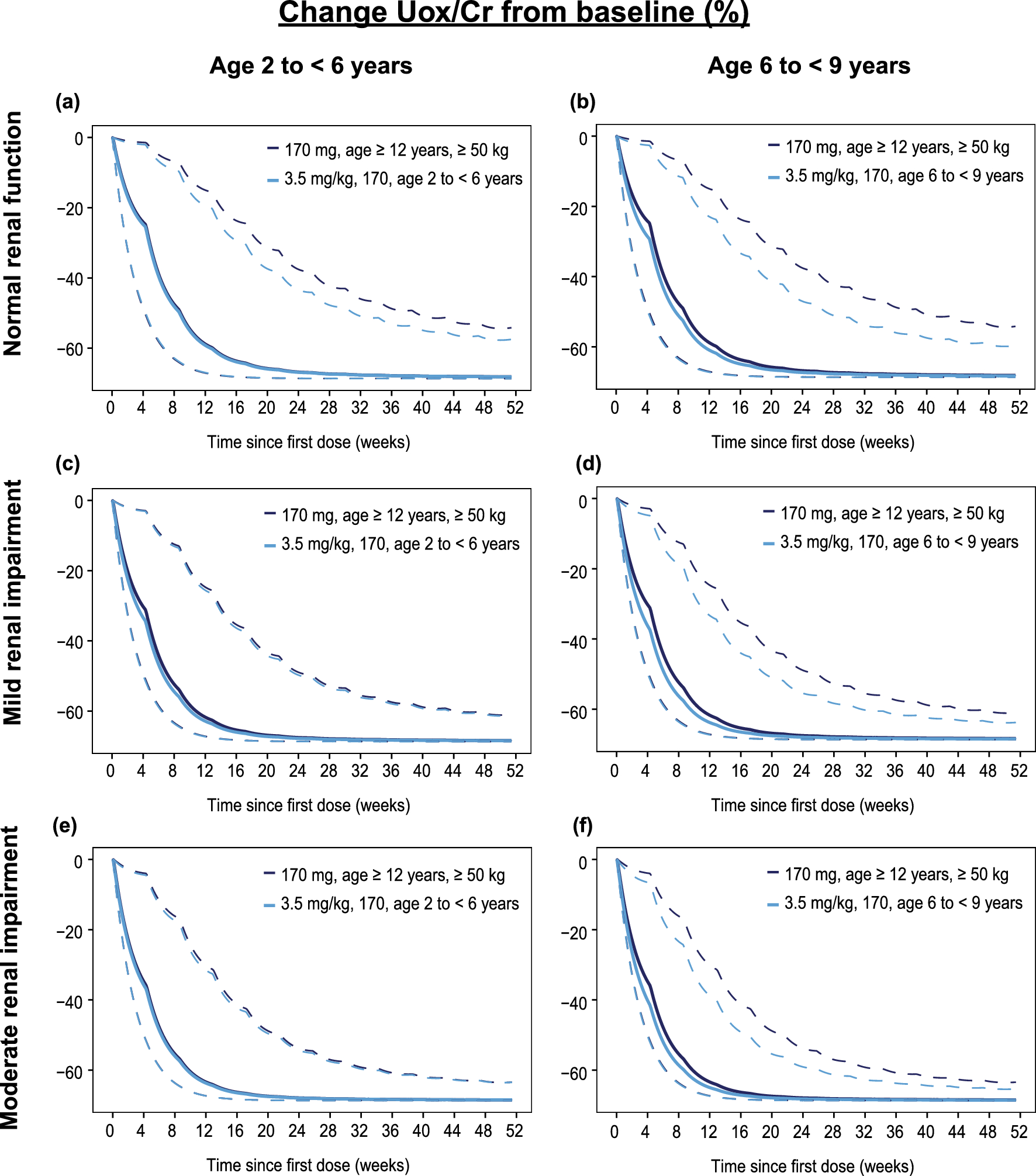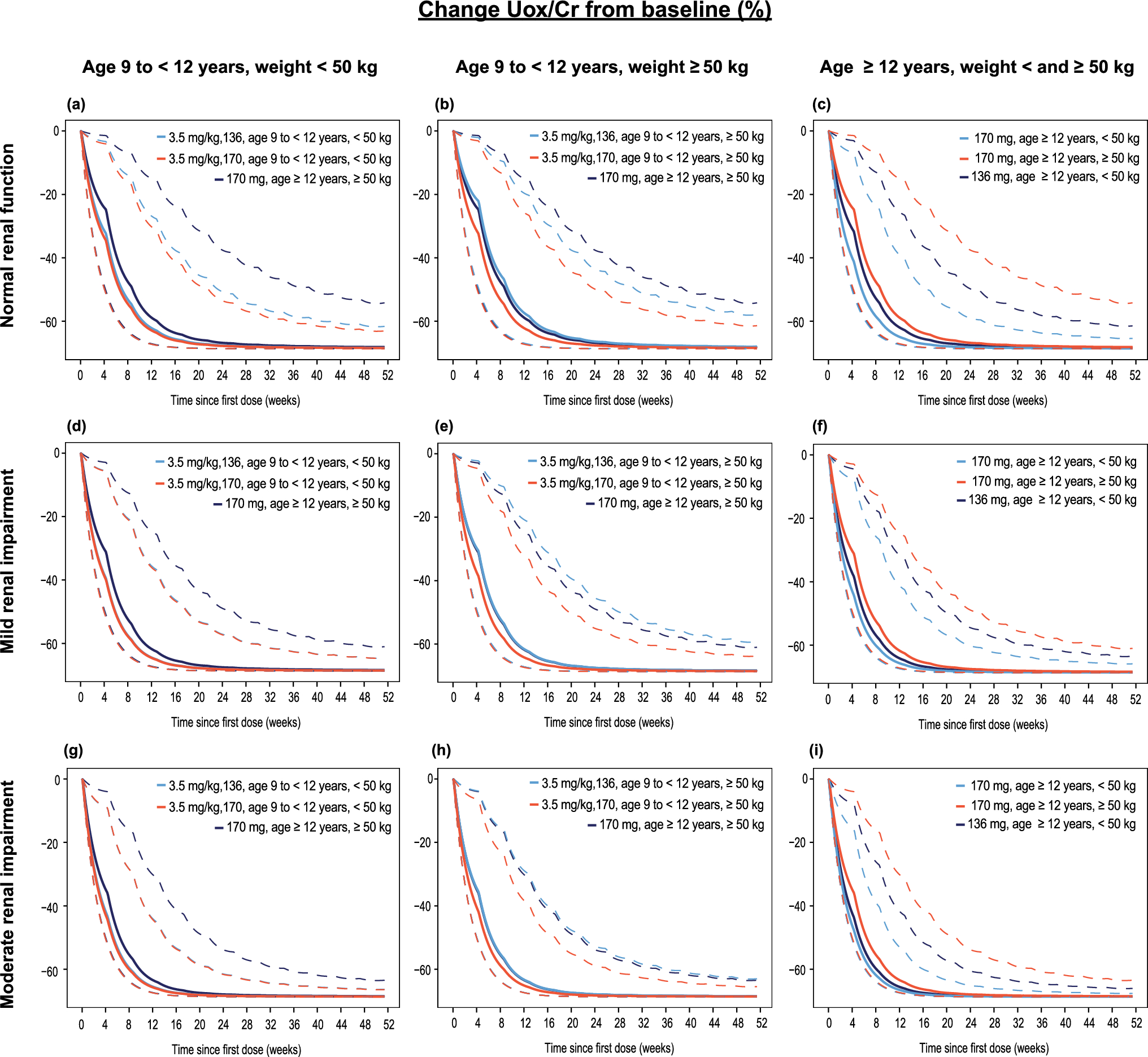 Additionally, Pop-PK/PD simulations showed a marginal improvement in the reduction of spot Uox/Cr for the population aged 9 to < 12 years with weight < 50 kg when the dose of 3.5 mg/kg Q1M is capped at 170 mg instead of 136 mg, and both maximum doses showed similar fold changes in exposures when compared to age ≥ 12 years weighing ≥ 50 kg with similar renal function.