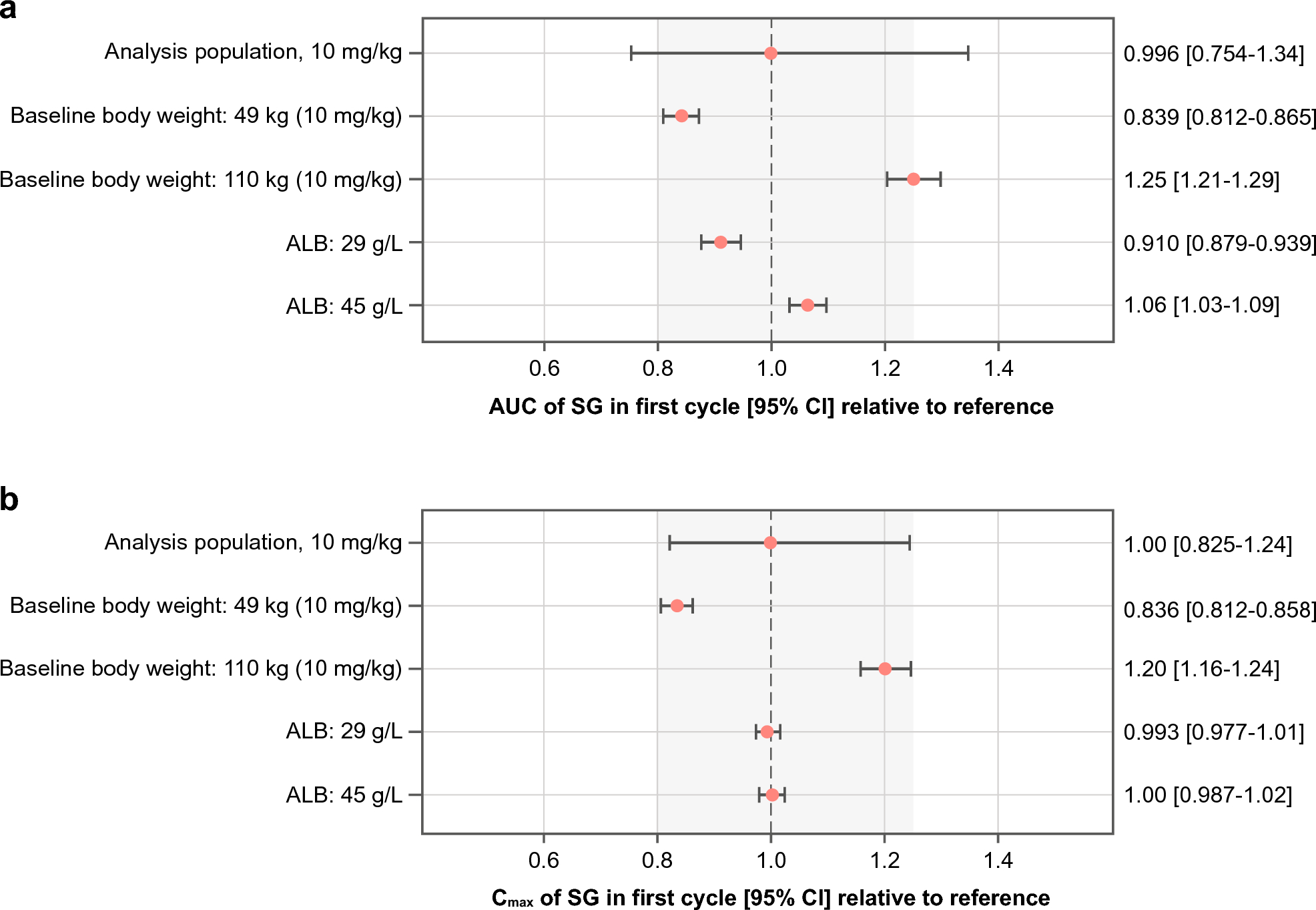 Impact of statistically significant covariates identified in the final model on predicted SG AUC (a) and Cmax (b). AUC and Cmax at the given covariate values were compared with those predicted for a typical patient with a body weight of 70 kg and baseline albumin of 38 g/L at the beginning of the study. Dots and error bars show the predicted relative exposure with 95% CI. ALB albumin, AUC area under the serum concentration-time curve, CI confidence interval, Cmax maximum (peak) serum drug concentration, SG sacituzumab govitecan