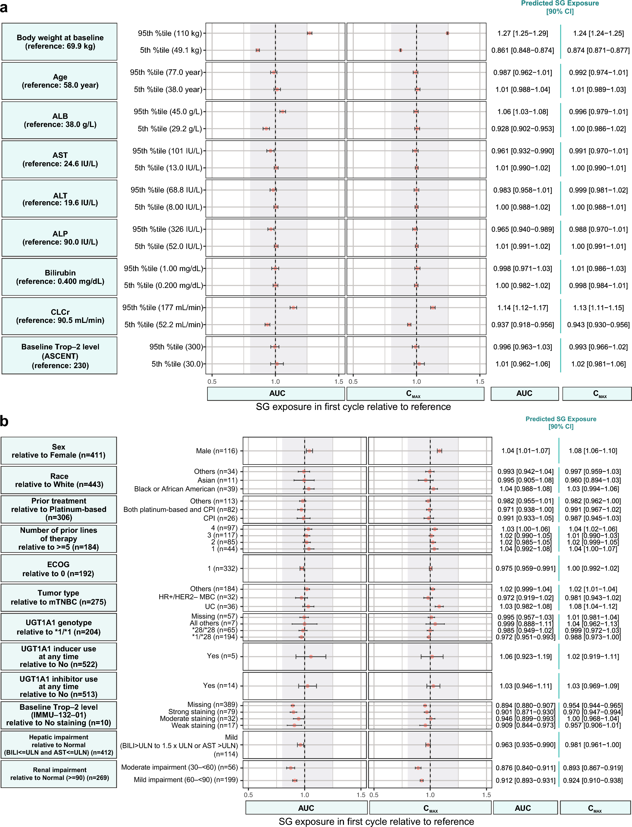 Relationships between continuous (a) and categorical (b) covariates to SG AUC or Cmax over the first treatment cycle relative to exposures in a typical patient with the reference covariate value. Gray band shows the 80–125% range. Dots and error bars show predicted exposure and 90% CI, respectively. Categories with less than five patients (three patients with ECOG score of 2, one patient with moderate hepatic impairment, three patients with severe renal impairment, and one patient with missing renal impairment level) were excluded from the plot. ALB albumin, ALP alkaline phosphatase, ALT alanine aminotransferase, AST aspartate aminotransferase, AUC area under the serum concentration-time curve, BILI total bilirubin, CI confidence interval, CLCr creatinine clearance, Cmax maximum (peak) serum drug concentration, CPI checkpoint inhibitor, ECOG Eastern Cooperative Oncology Group, HER2 human epidermal growth factor receptor 2, HR hormonal receptor, mBC metastatic breast cancer, mTNBC metastatic triple-negative breast cancer, SG sacituzumab govitecan, Trop-2 trophoblast cell-surface antigen-2, UC urothelial cancer, UGT1A1 uridine 5'-diphospho-glucuronosyltransferase 1A1, ULN upper limit of normal