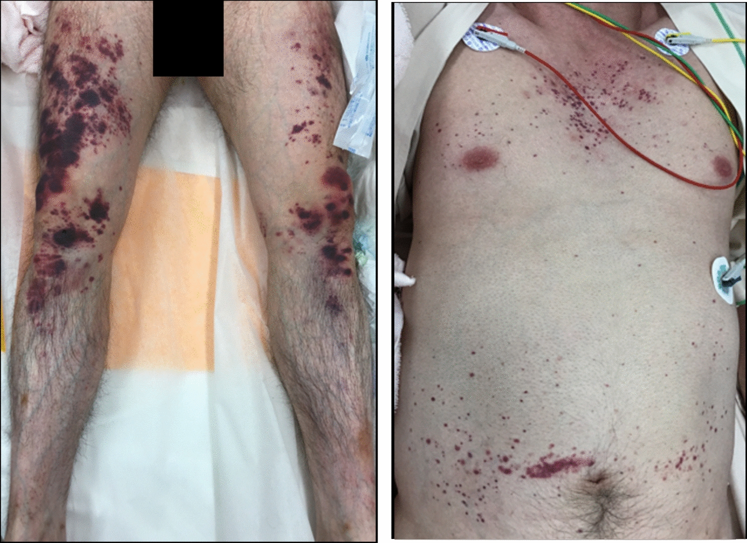 Elevated purpuric lesions were observed on the chest, abdomen, and thighs