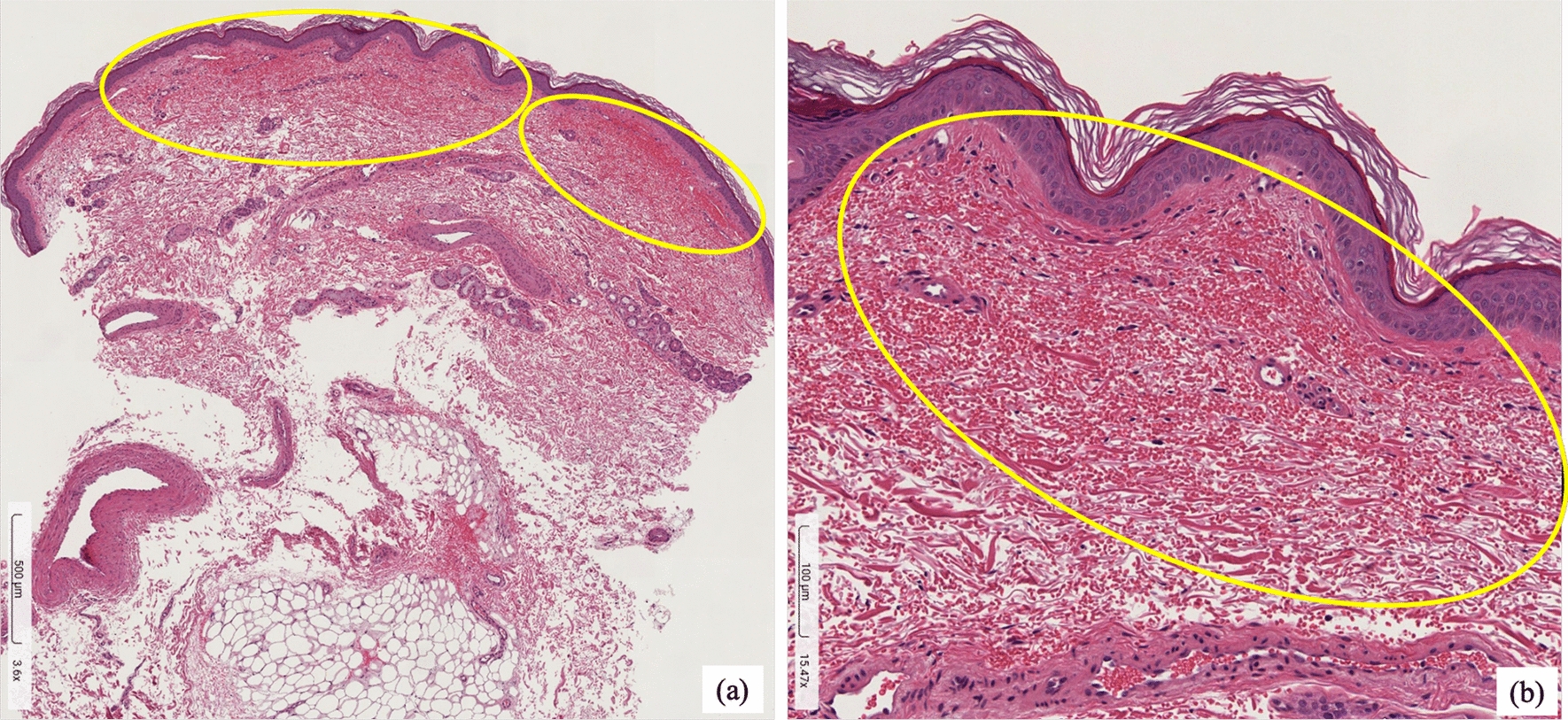 Histopathological examination revealed erythrocyte extravasation in the subcutaneous tissue (circle), consistent with subcutaneous hemorrhage. There was no evidence of vasculitis, such as inflammatory cell infiltration or fibrinoid necrosis