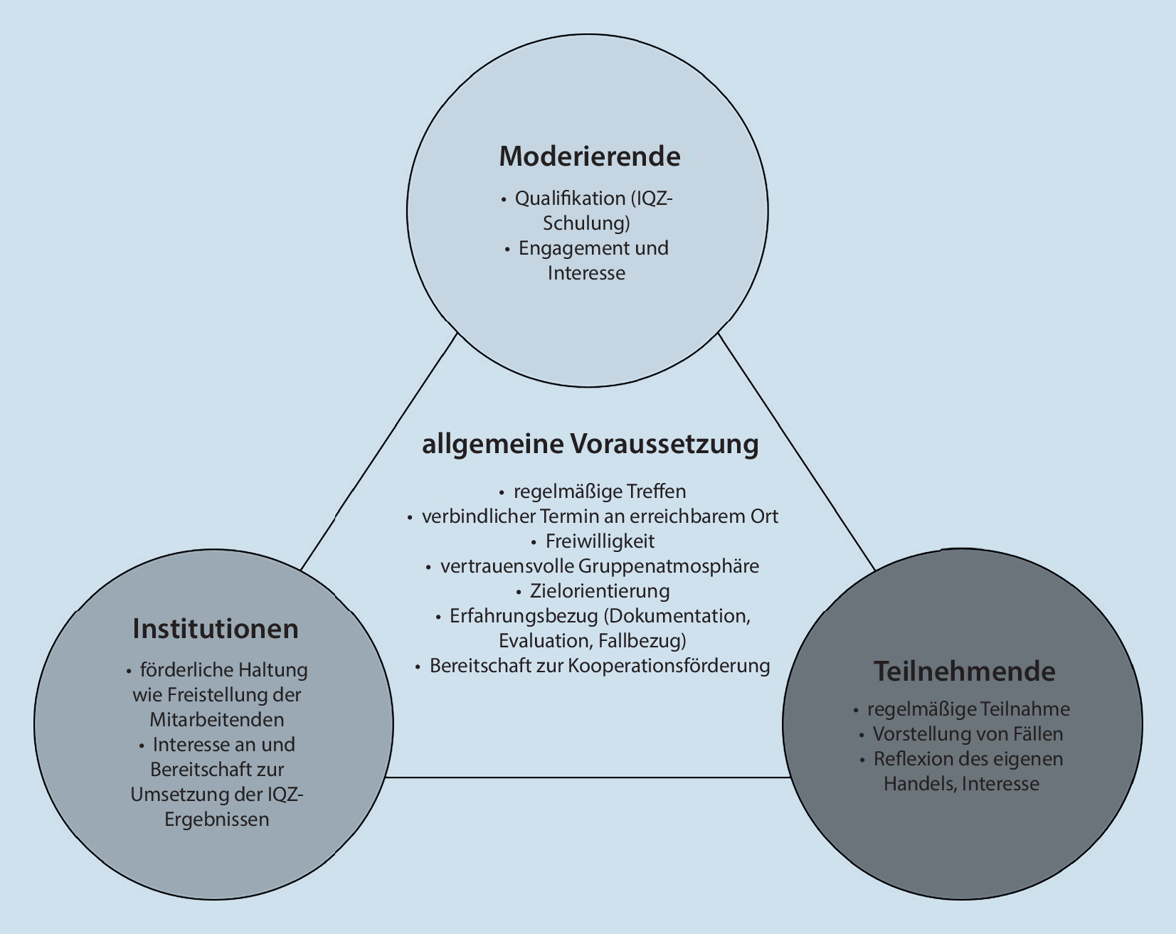 Die psychosoziale Beratung stellt somit eine wichtige Komponente der Schwangerenversorge im Bereich der PND dar. Studien zeigen jedoch, dass diese Angebote nur wenig in Anspruch genommen werden [3]. Auf Basis dieser Informationslage wurde im Zeitraum von 2002 bis 2007 ein Modellprojekt mit dem Titel „Interprofessionelle Qualitätszirkel in der Pränataldiagnostik“ von der Bundeszentrale für gesundheitliche Aufklärung (BZgA) durchgeführt, um den Aufbau interprofessioneller Qualitätszirkel (IQZ) deutschlandweit an sechs Standorten wissenschaftlich zu begleiten [6]. Projektziele waren die interprofessionelle Zusammenarbeit in der PND zu fördern und die Versorgungssituation von Schwangeren durch die stärkere Verankerung der psychosozialen Beratung in der Versorgungsstruktur zu verbessern [6]. Die Arbeit in einem IQZ wird dabei als Verfahren zur Qualitätssicherung im Bereich der Gesundheitsförderung und Prävention angesehen und eingesetzt [2, 8, 9]. In verschiedenen Veröffentlichungen sind Informationen zur Definition eines IQZs und Kriterien einer erfolgreichen Arbeit in einem IQZ zusammengetragen [1, 2, 6] und in Abb. 1 präsentiert.
