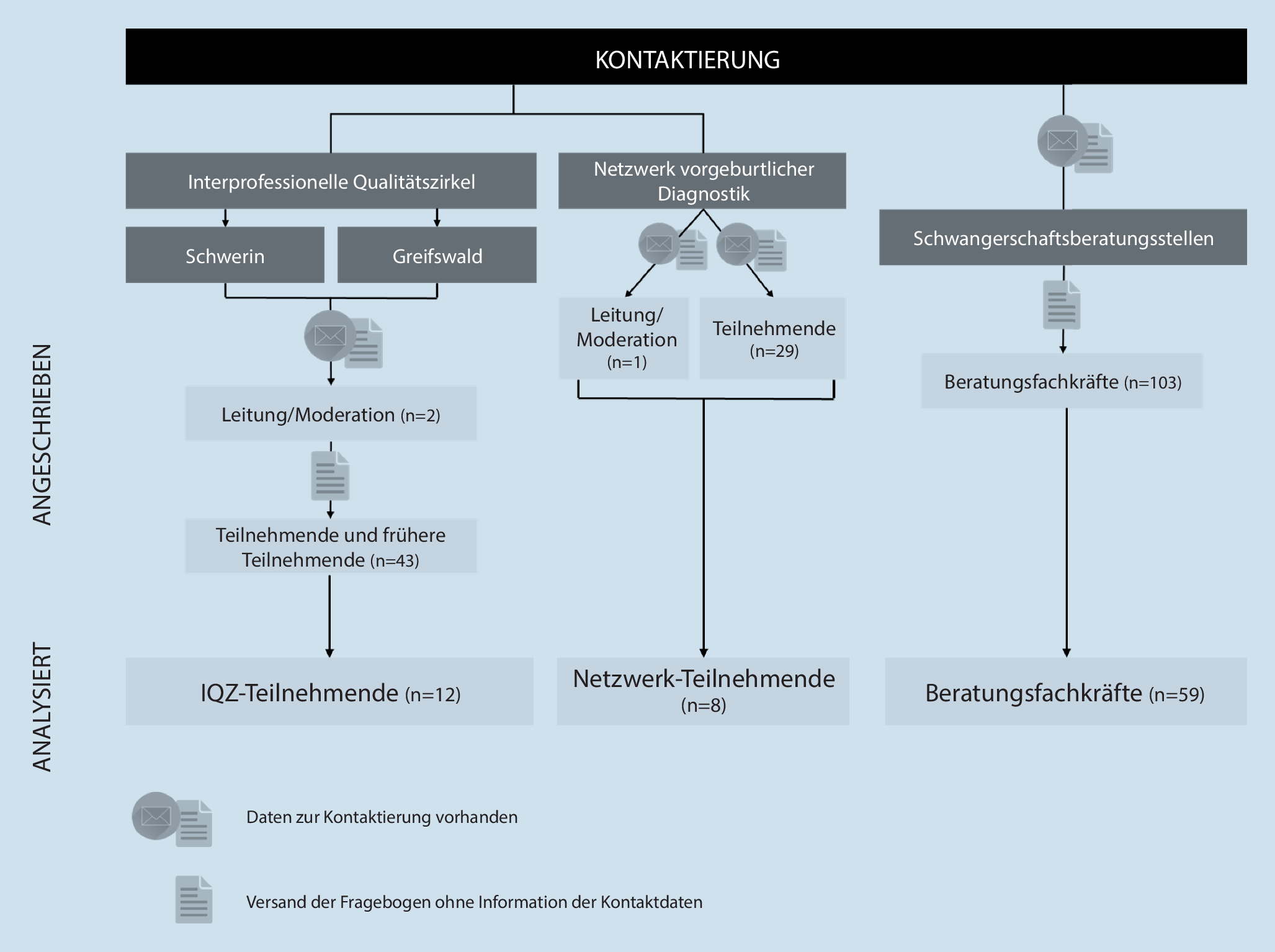 Eingeschlossen in die Befragung wurden (1.) Leitungspersonen der IQZ und des Netzwerks, (2.) deren frühere und aktuelle Mitglieder und (3.) Beratungsfachkräfte aller Schwangerschaftsberatungsstellen in Mecklenburg-Vorpommern. Die einmalige Befragung erfolgte im Zeitraum von 09/2022–12/2022 per Fragebogen. Die Studie wurde von der Ethikkommission der Universitätsmedizin Greifswald mit einem positiven Votum befürwortet (BB 124/22).