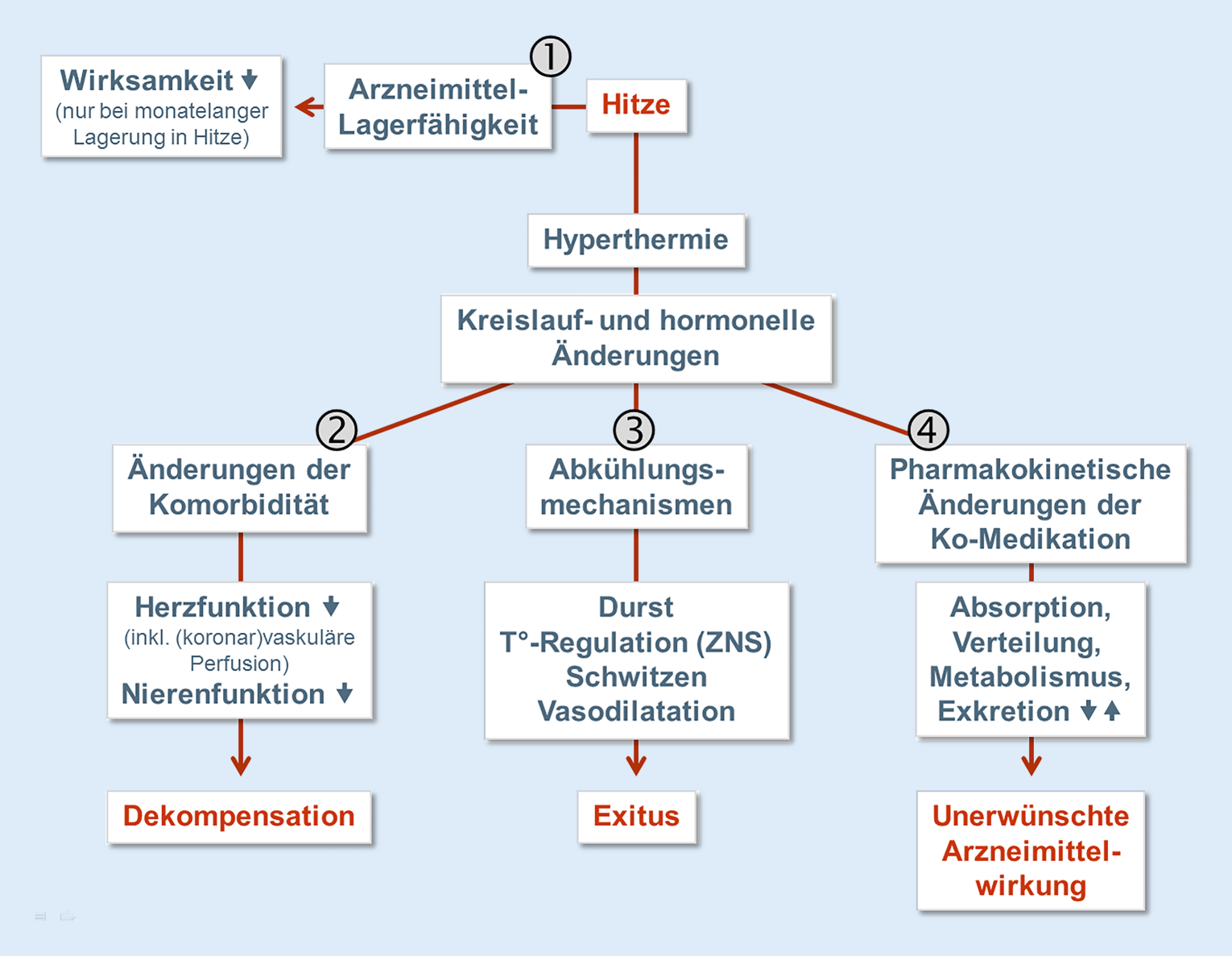 Die Anwendung von Arzneimitteln kann die Abkühlungsmechanismen des Körpers behindern und durch hitzebedingte Vorgänge können Wirkstoffe in ihrer Pharmakokinetik verändert werden. Zudem können hitzebedingte Gesundheitsschäden unerwünschte Arzneimittelwirkungen begünstigen. Daher bedarf es besonders im Sommer der kritischen Prüfung der Medikamentenliste.