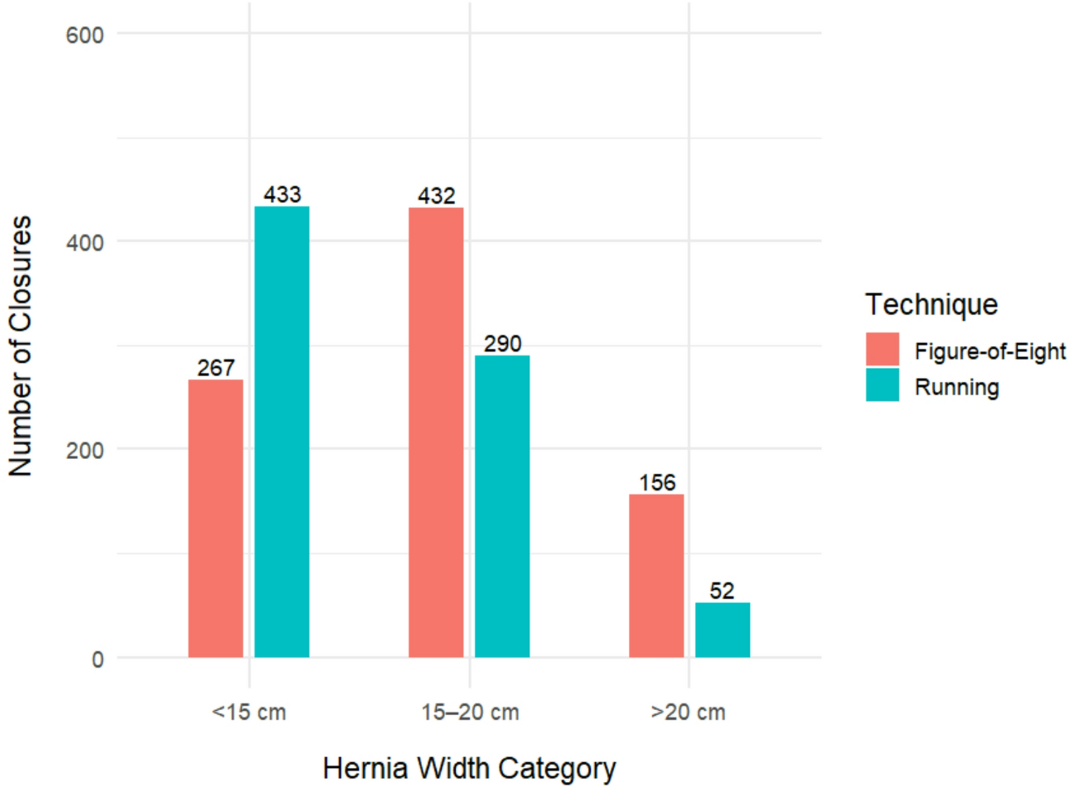 Fascial closure after TAR has a reported rate ranging from 81 to 97.2% in the literature [7‐9]. Our 93.9% overall fascial closure rate is nearly identical to that of a recent meta-analysis citing a rate of 93.8% successful fascial closure after TAR [10]. While most studies report their cohort’s mean or median hernia width and respective fascial closure rate, ours is the first to model fascial closure rates by each cm increase in hernia width [1, 11‐13]. Notably, among patients achieving successful closure, larger defects were more frequently closed using figure-of-eight sutures compared to a running technique. Moreover, by modeling this relationship using a weighted logistic regression approach, we offer a means to estimate the likelihood of closure across a spectrum of defect sizes that directly correlates with differences in postoperative outcomes. While multiple factors influence surgical decision-making, the ability to objectively quantify the probability of successful fascial approximation represents a critical tool for evidence-based preoperative planning and enabling individualized risk stratification for these challenging cases.