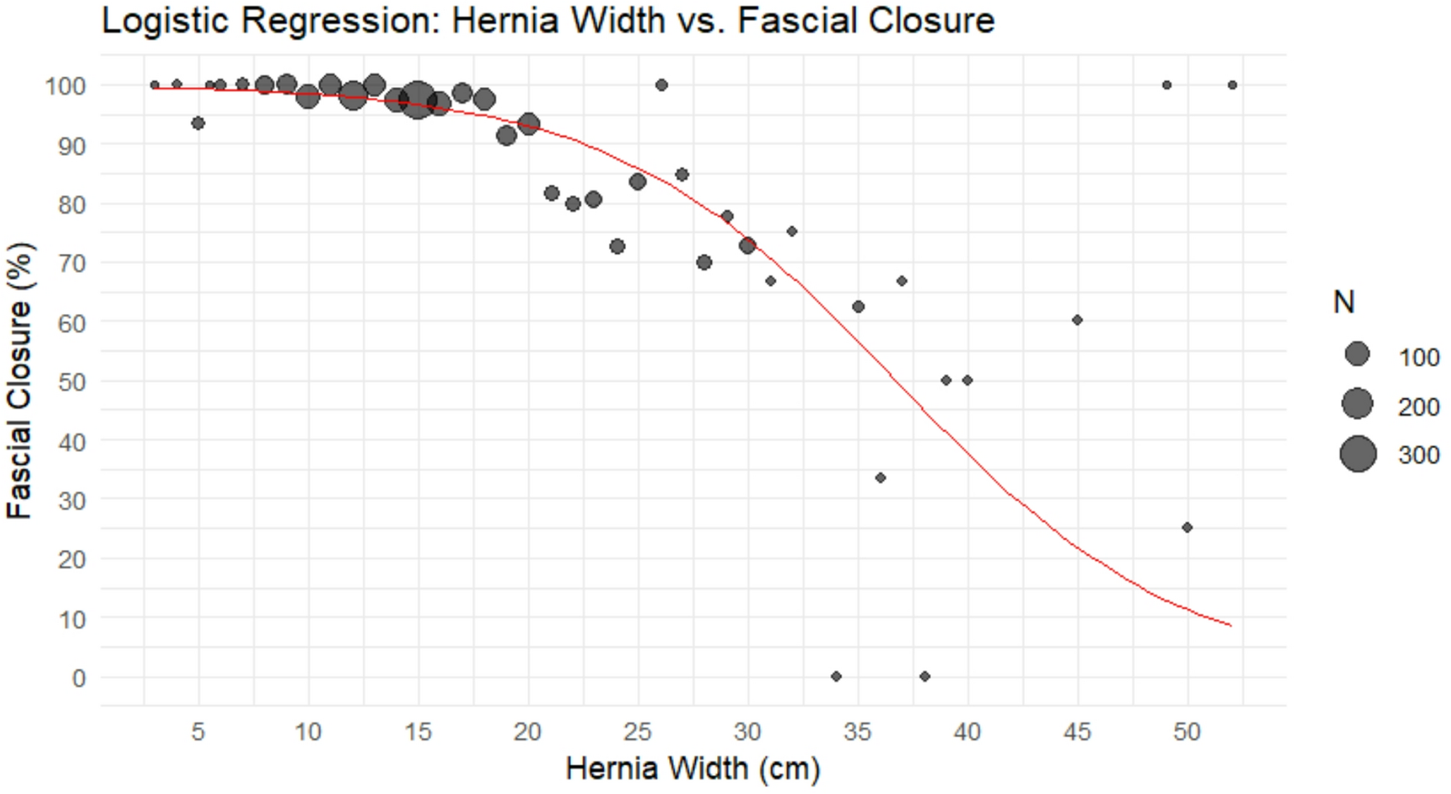 Fascial closure rates were calculated for each centimeter increase in hernia width. To evaluate the association between hernia width and the probability of achieving fascial closure, a weighted logistic regression model was fitted with fascial closure status as the dependent variable and hernia width (in cm) as a continuous predictor. From this model, predicted fascial closure rates by hernia width were computed using the inverse-logit transformation.