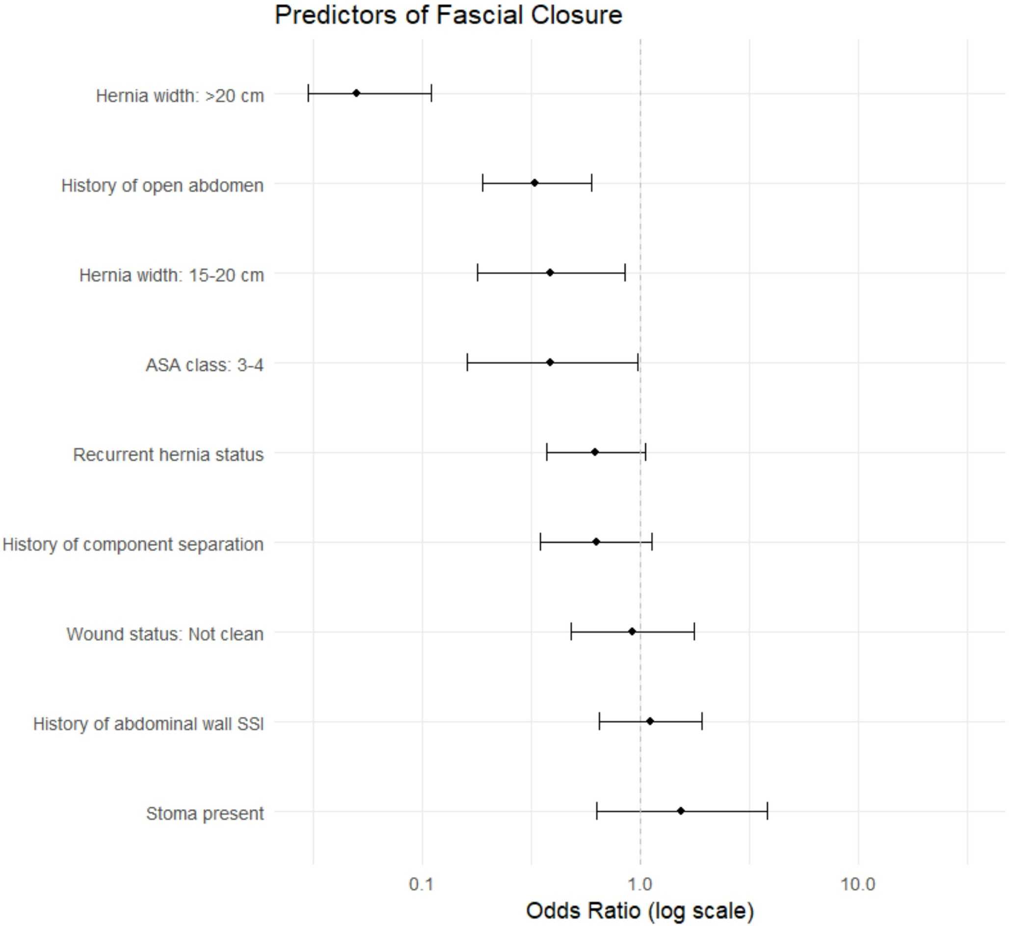 Predictors of Fascial Closure: Multivariate Regression Model. This forest plot displays the odds ratios (ORs) and 95% confidence intervals (CIs) from a multivariable logistic regression model evaluating predictors of fascial closure in patients undergoing open ventral hernia repair. Hernia size is modeled by hernia size group using the < 15 cm hernia width group as a reference. Additional covariates were history of open abdomen, ASA class, history of component separation, recurrent hernia, currently active infection, wound status, abdominal wall SSI history and presence of a stoma