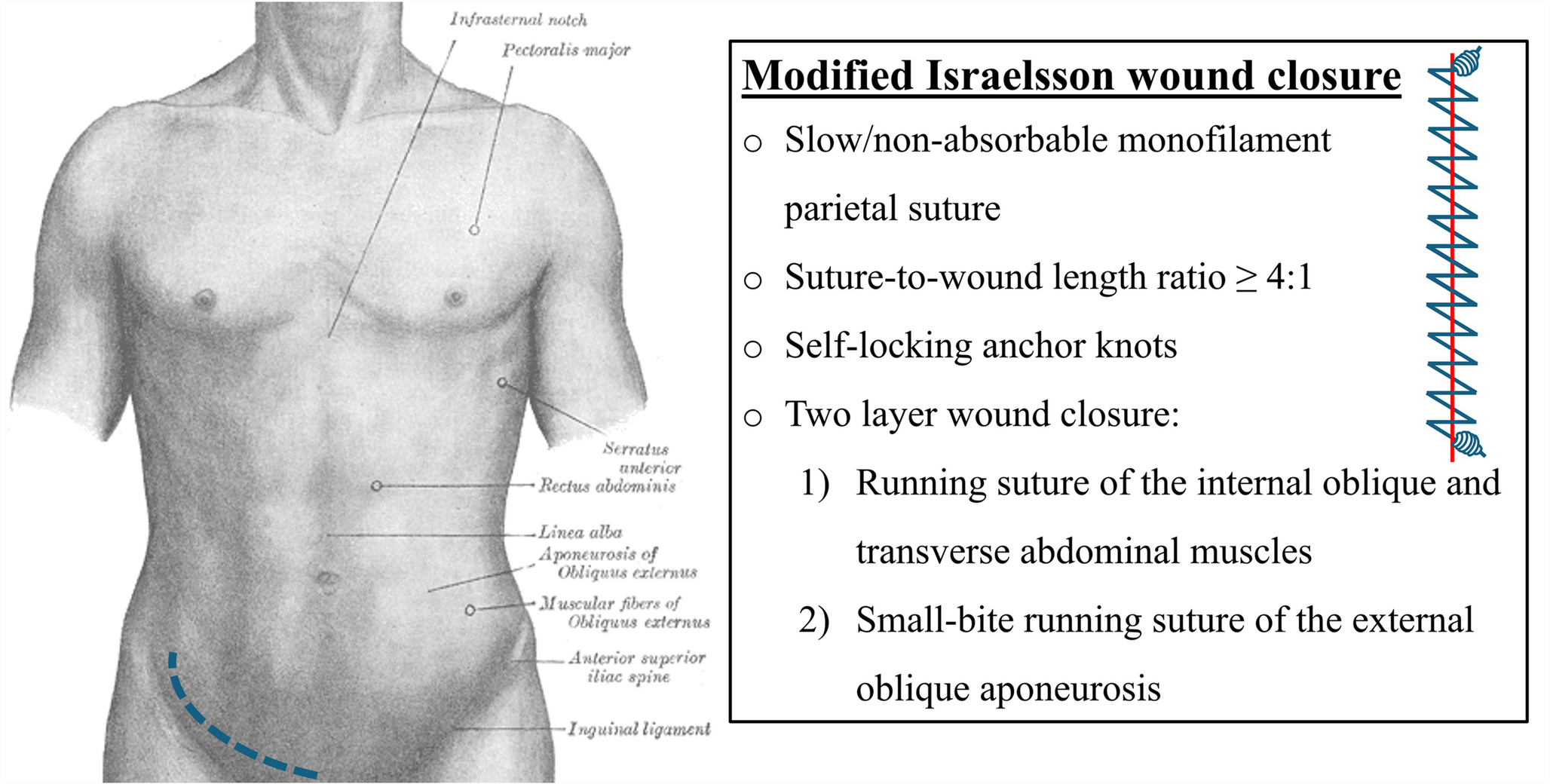 Schematic illustration of the modified Israelsson technique. The method includes a two-layer parietal closure using slow/non-absorbable monofilament sutures, self-locking anchor knots, and a suture-to-wound length ratio ≥ 4:1. The deep parietal layer involves a running suture of the internal oblique and transverse muscles; the superficial layer closes the external oblique aponeurosis with a small-bite running suture. The anatomical image of the abdominal surface is adapted from Gray’s Anatomy, 20th edition (1918, public domain)