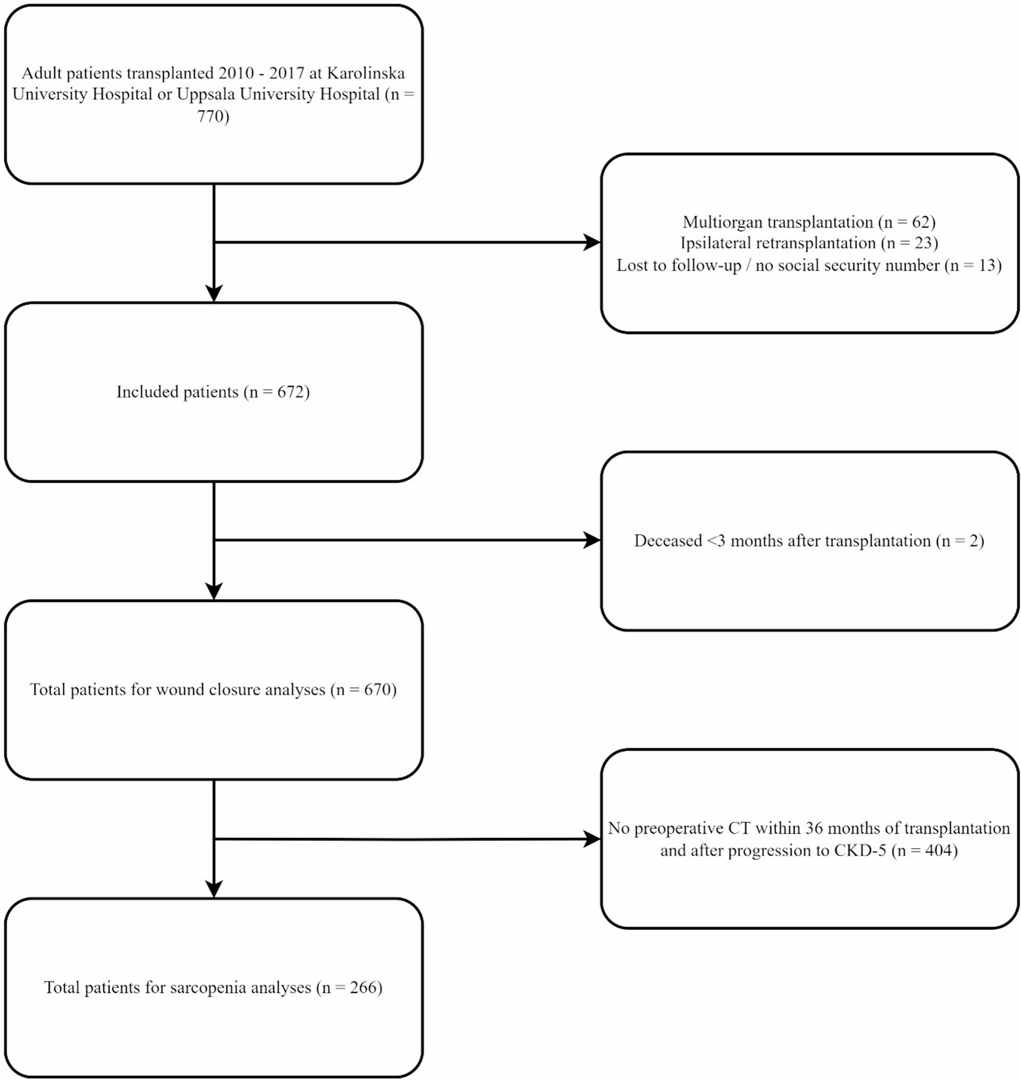 In the subgroup analysis of sarcopenia, eligible patients were those with a preoperative CT scan within 36 months of transplantation and after progression to stage 5 chronic kidney disease (CKD-5). The CT images of the L3 level were exported and the area of muscle measured using preestablished cut-offs for both skeletal muscle (−29 to + 150 Hounsfield units) and fatty muscle (−29 to + 30 Hounsfield units). The resulting value was divided by height squared (m2) to provide the SMI and fatty skeletal muscle index (FMI). Only patients transplanted in Region Stockholm and Region Gotland were considered for the subgroup analyses owing to restrictions in the ethical approval. All measurements were performed in Image J (National Institute of Health) [16].