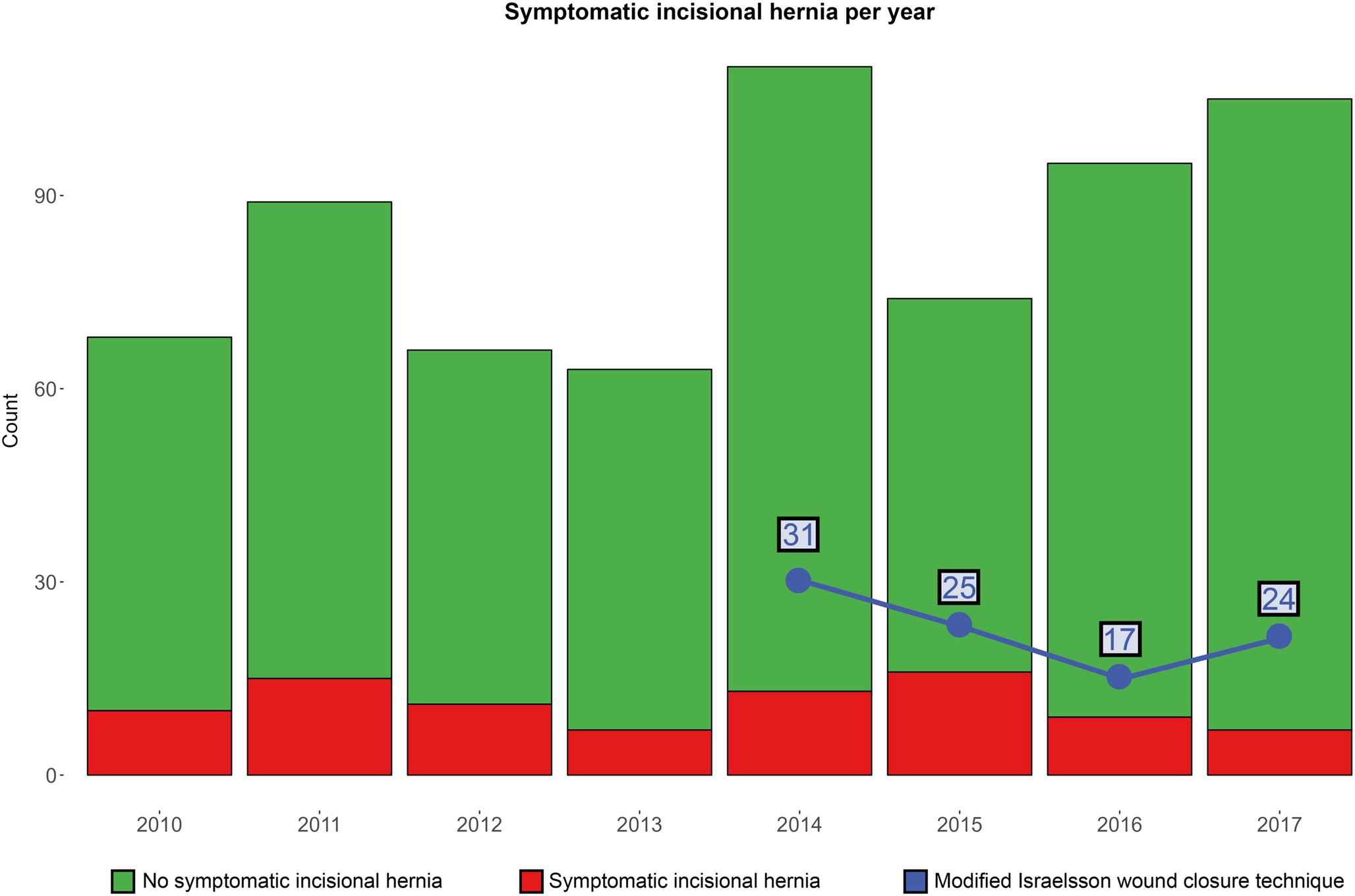 Our study has several limitations. First, the primary outcome in our study was symptomatic IH, according to data obtained retrospectively from medical records. While symptomatic IH is a clinically relevant endpoint and frequently used in hernia literature, relying on reported symptoms might underestimate the true incidence, as asymptomatic or mildly symptomatic hernias could be overlooked. This could mean that the actual number of IH cases is higher, and consequently, the protective effect of the “modified Israelsson technique” even more pronounced than suggested by our current estimates. Future prospective studies using standardized imaging protocols for all patients would be beneficial to capture the full spectrum of IH.
