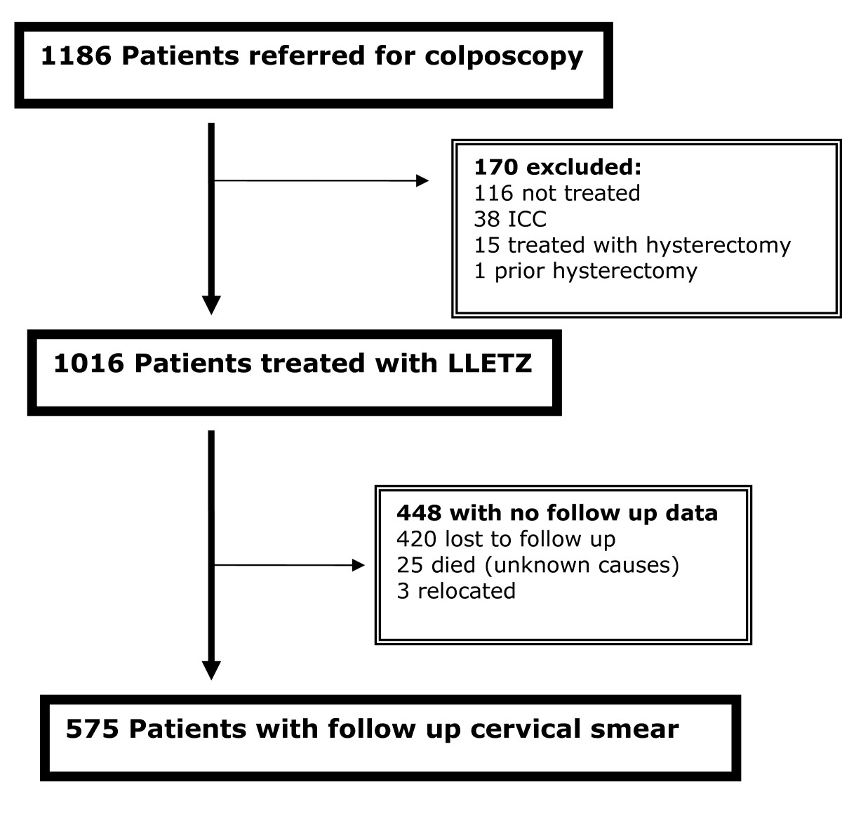 Between April 2003 and November 2006, 1186 women were referred to the colposcopy clinic at Chris Hani Baragwanath Hospital (CHB) in Soweto. Of these, 1016 had a LLETZ performed and 575 (57%) women returned to the clinic for a follow-up cervical smear and were included in this analysis (Figure 1). LLETZ treatment was not offered to 170 women: 116 of whom were not eligible for treatment at the time (pregnancy, normal cervix on colposcopy, CIN 1 in immunocompetent women), 38 had invasive cervical cancer, and 15 required hysterectomy for other reasons. 290 women had normal follow-up cervical smears(50.4%) and 285(49.4%) women had persistently abnormal smears after LLETZ. We included any abnormal Pap smear after treatment in the group classified as persistence, that is any grade of abnormality and any Pap smear after treatment.