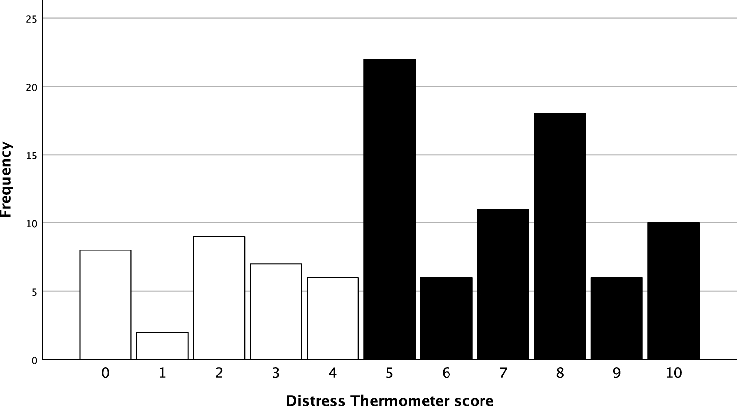 Frequency analysis and bar chart of the Distress Thermometer. DT scores ≥ 5 are colored in black, DT scores < 5 are colored in white. Cut-off score of 5 was chosen. The most common DT score was 5 (n = 22)