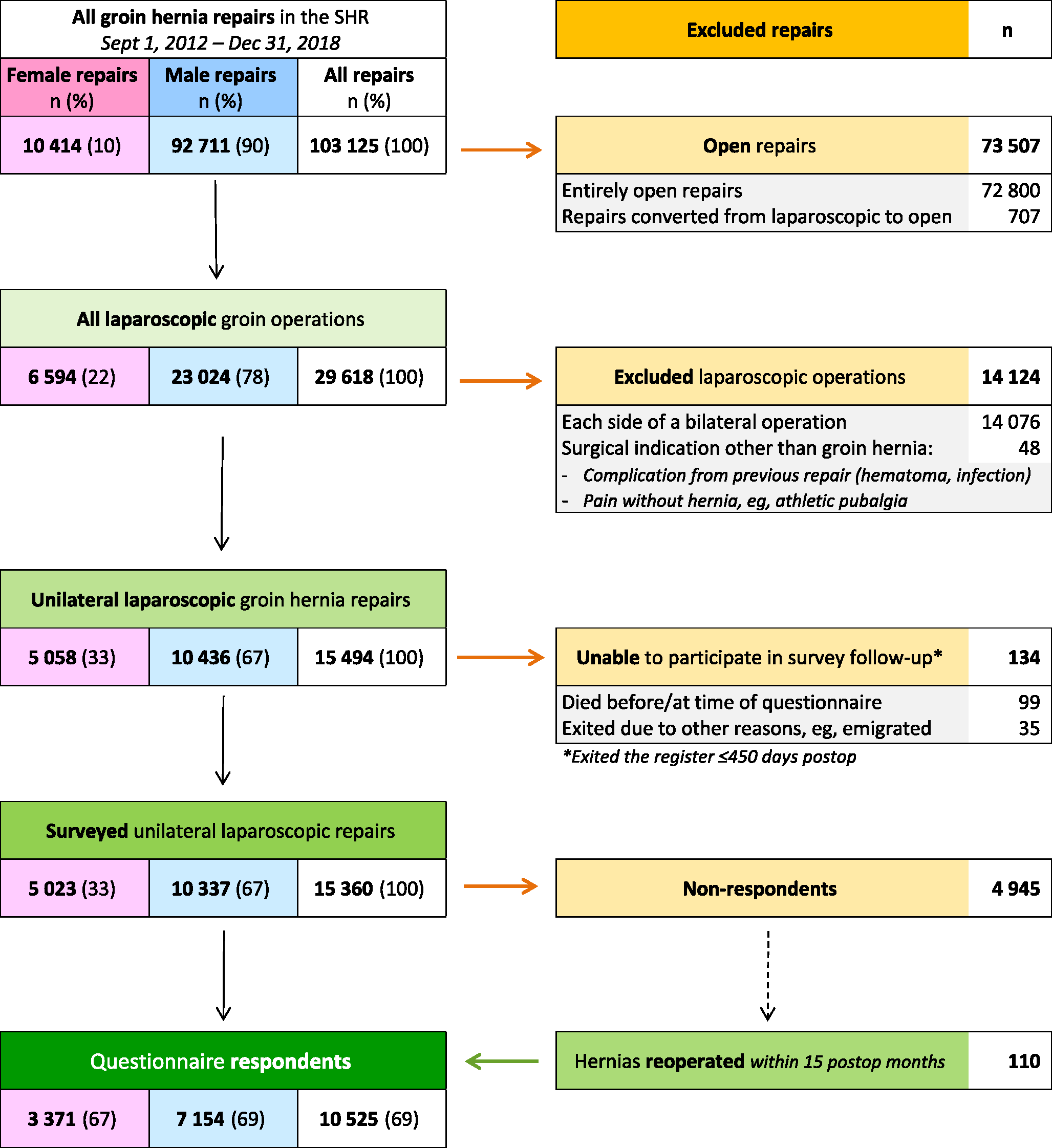 This analysis used a comprehensive SHR dataset containing detailed patient and surgical information from September 1, 2012, with follow-up data (questionnaire responses and reoperations) through November 6, 2020. Patients who underwent bilateral repairs were excluded, as the single questionnaire did not distinguish between left- and right-sided pain. Consequently, only unilateral repairs were included.
