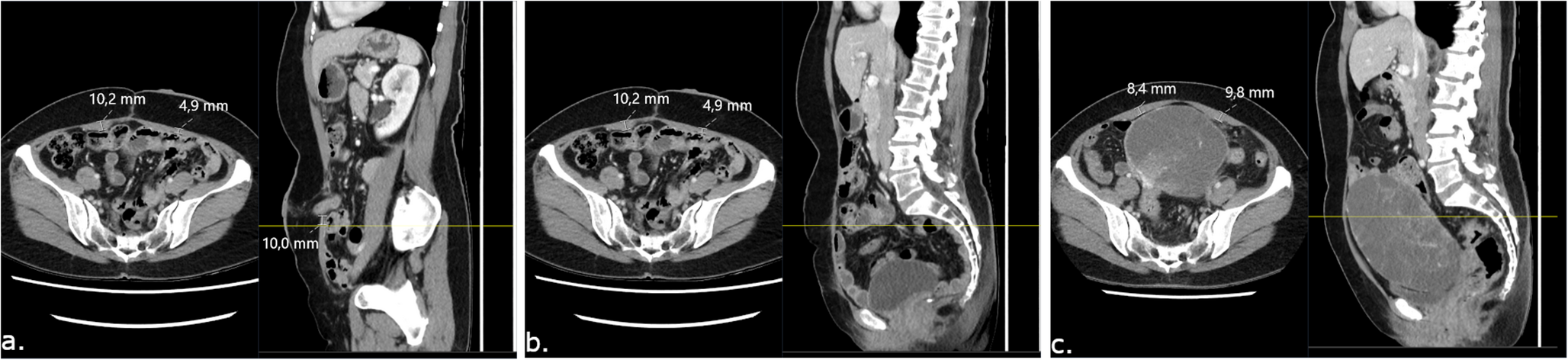 Abdominal rectus muscle (ARM) measurements on computerised tomography (CT) scans of rectal cancer patients subjected to tumour resection with permanent end colostomy. First, on postoperative CT (a.), the location of the stoma is identified, and ARM measurements are made on axial slices 1 cm caudal to the stoma aperture. On sagittal slices (b.) the craniocaudal level at which the measurements were made is then established in relation to fix structures such as the vertebral column. Then, on preoperative imaging (c.) the same craniocaudal level is identified and ARM measurements are made on axial slices the same way as in (a.)