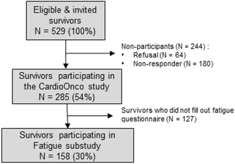 Our study is the first study on prevalence and factors associated with CRF among Swiss adult CCS. Since the study setting allowed gathering high-quality and reliable data on treatment exposures, current medical histories, anthropometry, and CCS lifestyles, the study setting was valuable. It allowed analyzing details from a spectrum of possible factors associated with CRF when compared with studies with only self-reported data. However, the study setting was also a limitation since the main study interest was assessing cardiovascular health during outpatient clinic visits. For this reason, survivors had to accept the invitation and attend the outpatient clinic after which they received the fatigue questionnaire—a potentially significant obstacle for severely fatigued survivors and likely contributor to the relatively low participation rate of 30%. For this reason, severely fatigued CCS are possibly underrepresented in our study. However, when comparing participants with those who took part in the CardioOnco study but did not fill out fatigue-measuring instruments in the questionnaire, we can see that there are no significant differences between these two populations. The study design possibly introduces further selection bias, since CCS treated with surgery only were excluded, yet current research shows no effect of surgical treatment on CRF among CCS [