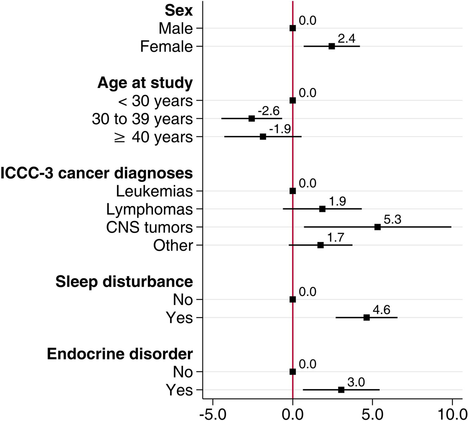 Sleep disturbance and endocrine disorders were associated with increased CRF in our study. Meeske et al. also reported a significant association between sleep disturbance and CRF among 161 adult survivors of acute lymphoblastic leukemia (OR = 6.15; 95% CI 2.3–16.2) [