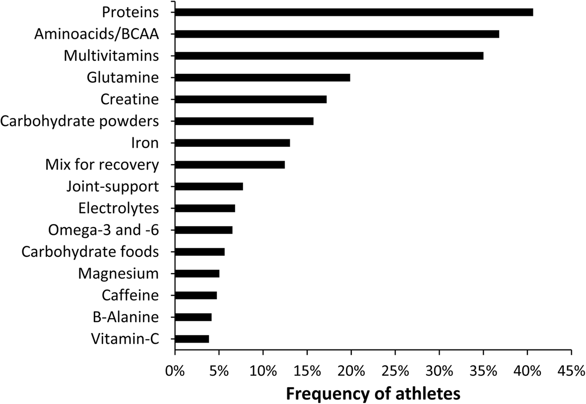 The most consumed dietary supplements were proteins, amino acids/BCAA, multivitamins, glutamine, and creatine (Fig. 3). A very similar pattern for the type of supplements consumed has been reported in other studies where proteins [32], multivitamins [31], and creatine [29] were found to be the most consumed substances. However, as a novelty of this investigation, the data indicate that the most prevalent group of substances were ones that had little scientific evidence (Fig. 1). This effect was produced by the high number of supplements available in the market that contain minimal evidence of its effectiveness. Although this in the first investigation that suggests this finding, it could be ventured from previous literature due to the gaps in knowledge about effective nutrition and supplementation found in coaches and athletes [24]. This outcome is likely the result of current supplementation practices that imply a poor knowledge about the effect and efficacy of supplements along with reliance on sources with low credibility, at least in this sample of high-performance athletes.
