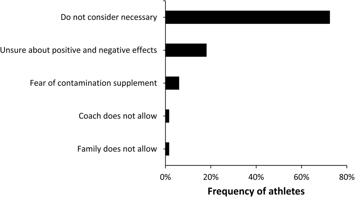 Among the athletes that did not report any use of supplements (n = 190), the main reason was that they did not consider them necessary to maintain their level of fitness (Fig. 6). A low proportion of athletes did not consume supplements because their family/coach did not allow this practice.