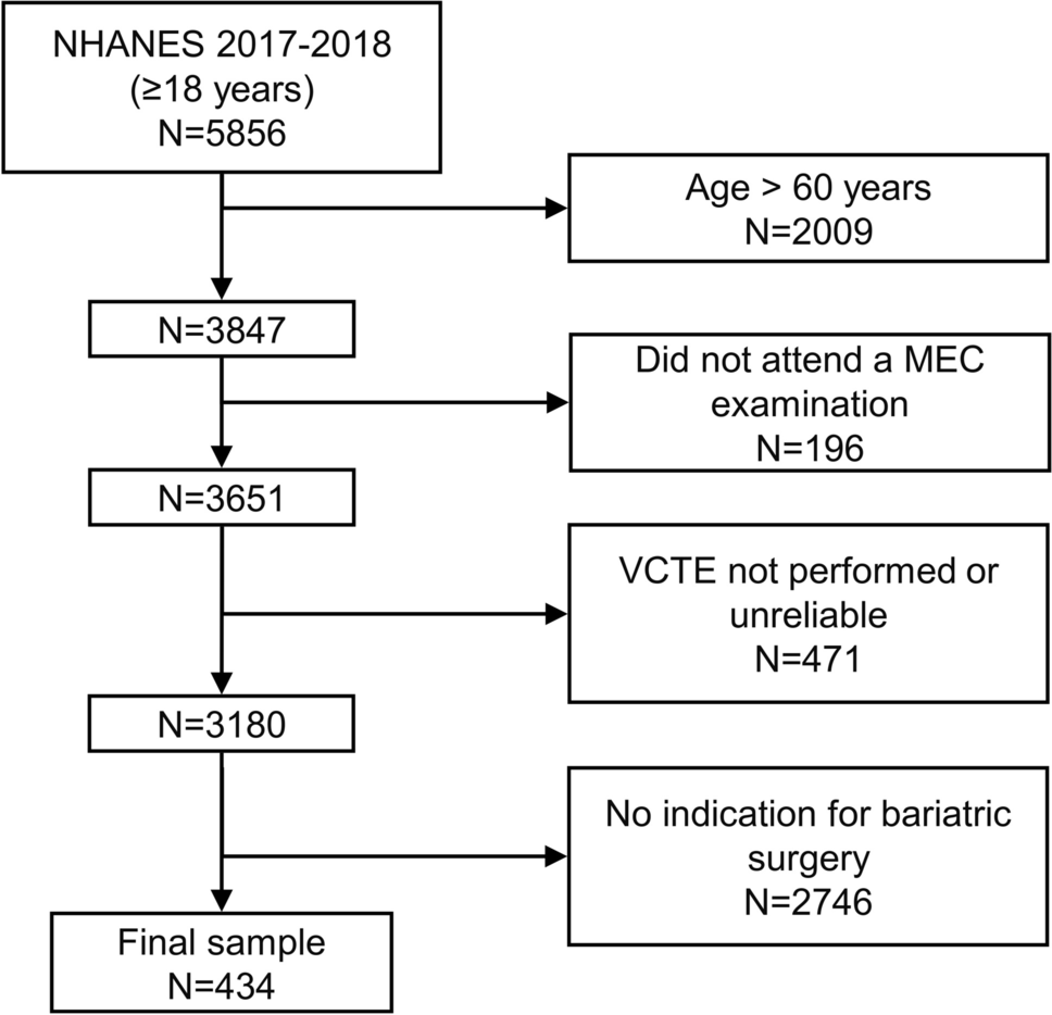 From a total of 5856 adult participants included in the survey, 3847 were aged 18–60 and, of those, 3651 attended a MEC visit. We initially excluded individuals without a reliable VCTE exam, leading to 3180 potential candidates. Finally, by applying inclusion criteria for a bariatric surgery intervention, our final sample consisted of 434 individuals (Fig. 1).