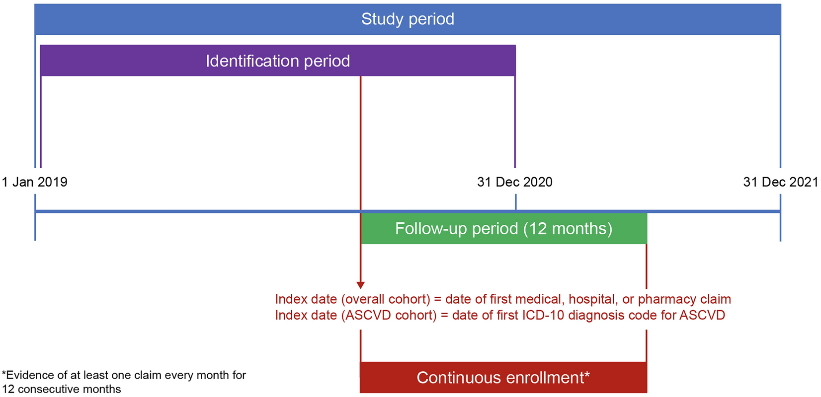 For inclusion in the ASCVD cohort, patients must have had one or more International Statistical Classification of Diseases, 10th Revision (ICD-10) diagnosis codes for ASCVD during the identification period, regardless of whether the ASCVD diagnosis was their first presenting diagnosis or they had received one or more previous ASCVD diagnoses prior to the identification period. Following the initial ASCVD diagnosis during the identification period (the “ASCVD index date”), subsequent claims were not required to be related to ASCVD diagnosis or management to meet continuous enrollment criteria for inclusion in the ASCVD cohort. The ICD-10 diagnosis codes for ASCVD used to identify patients for this analysis included those associated with a cerebrovascular, coronary, or peripheral vascular event. The full list of ASCVD diagnostic codes used is presented in Supplementary Table S1, and the process for evaluating the ASCVD cohort is presented in Supplementary Table S2.