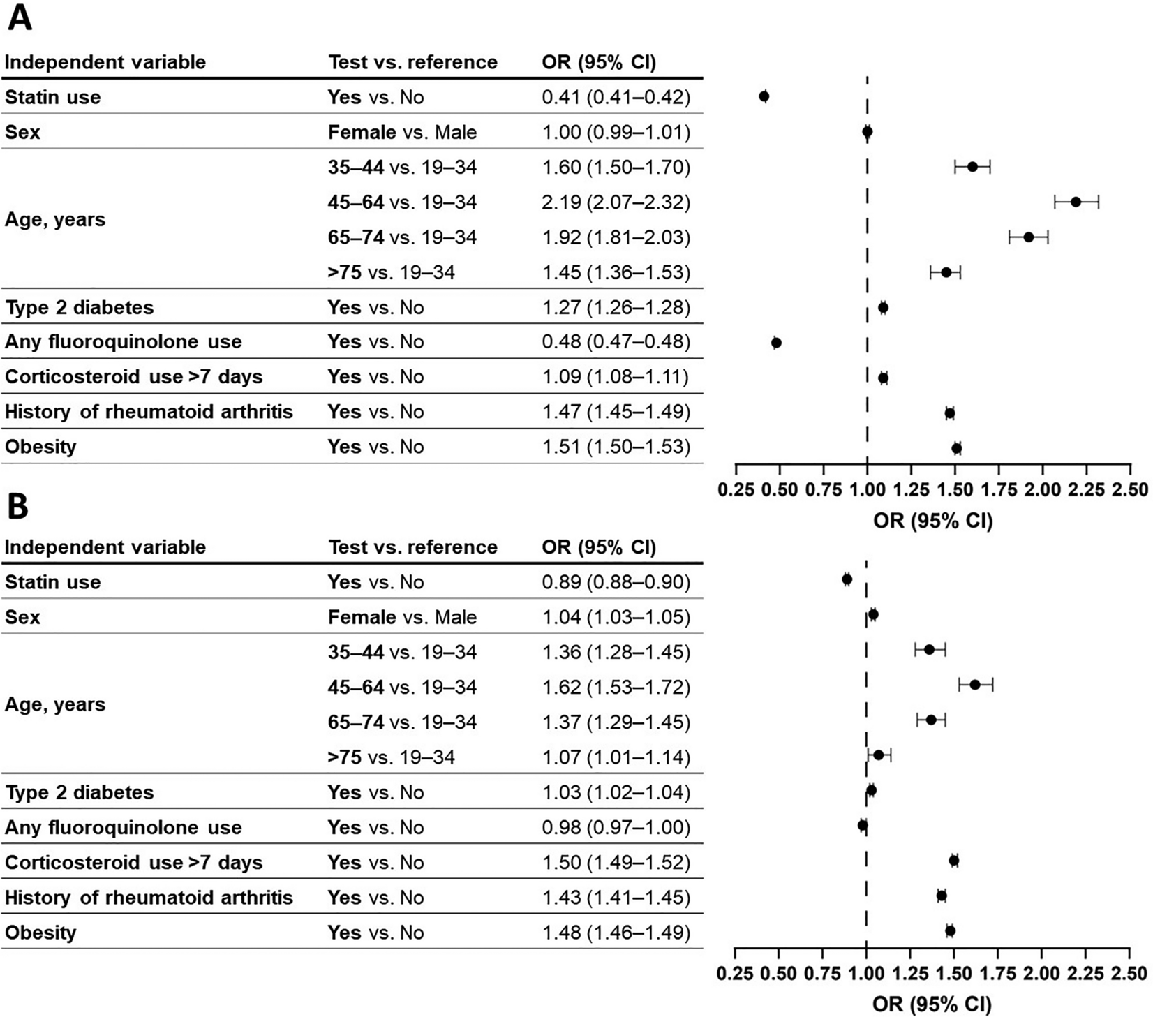 TRT prevalence was also evaluated among various subgroups of interest within the ASCVD cohort: sex (male vs. female), age (19–34, 35–44, 45–64, 65–74, and ≥ 75 years), comorbid medical condition status (type 2 diabetes, obesity, and rheumatoid arthritis [yes vs. no]), and use of systemic fluoroquinolones or corticosteroids, statins, or bempedoic acid at any time during the ASCVD follow-up period (yes vs. no). The presence of a comorbid medical condition was based on having an International Statistical Classification of Diseases, 9th Revision, or ICD-10 diagnosis code consistent with that condition. Medication use was defined as having a pharmacy claim for a prescription within the ASCVD follow-up period, either at any time in relation to the TRT diagnosis or (to explore the potential impact of medication use on TRT) prior to the first instance of TRT. In the latter analysis, use of statins, fluoroquinolones, or corticosteroids (or any combination thereof) was only considered to be associated with TRT if the prescription was issued prior to the first diagnosis of TRT in the ASCVD follow-up period. Systemic corticosteroid use was defined as use for more than 7 days, as the risk of TRT increases with treatment duration [36]. For statins and systemic fluoroquinolones, no requirements were placed on the duration of medication use.